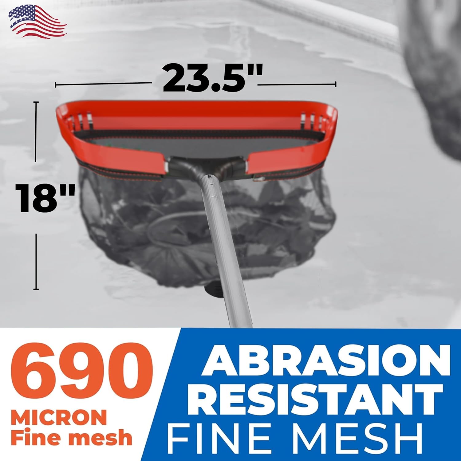 - WORK FASTER WITH "GOLDILOX" 690 MICRON MESH - The perfect "just right" combination of speed and filtration. Grab nearly all surface and sunken pool debris (anything larger than sand and silt) from your client's pool without "pushing" the water. Skim and rake as quickly and efficiently as possible, banking that time for more pools or more family time after a long day.