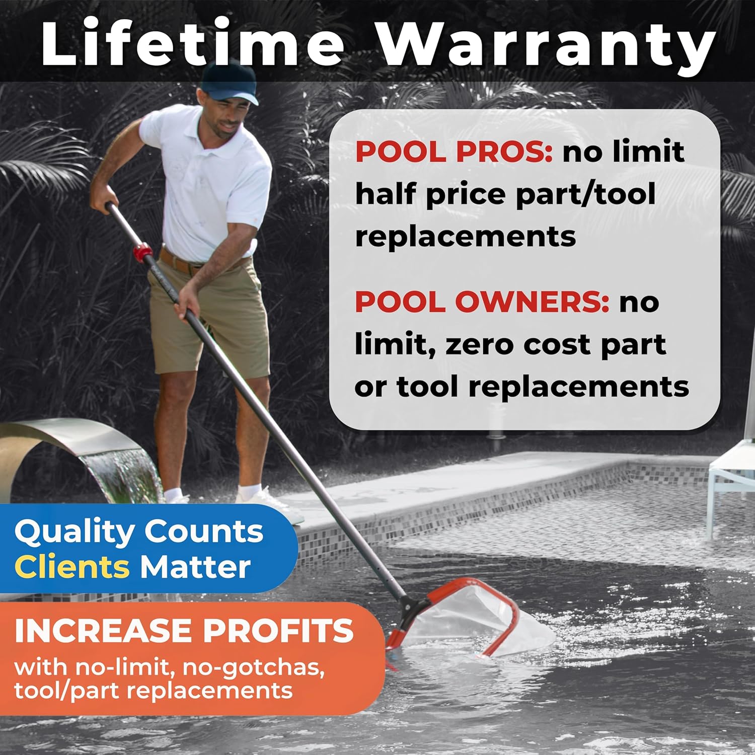 - NEARLY ELIMINATE DOWNTIME DUE TO BROKEN TOOLS - Keep an unlimited number of your fine mesh pool silt net part replacements (handles, nets, rims) in your truck (all at half off retail) for quick and easy on-site tool repairs. Stay on the job, making money and working hard for your clients.