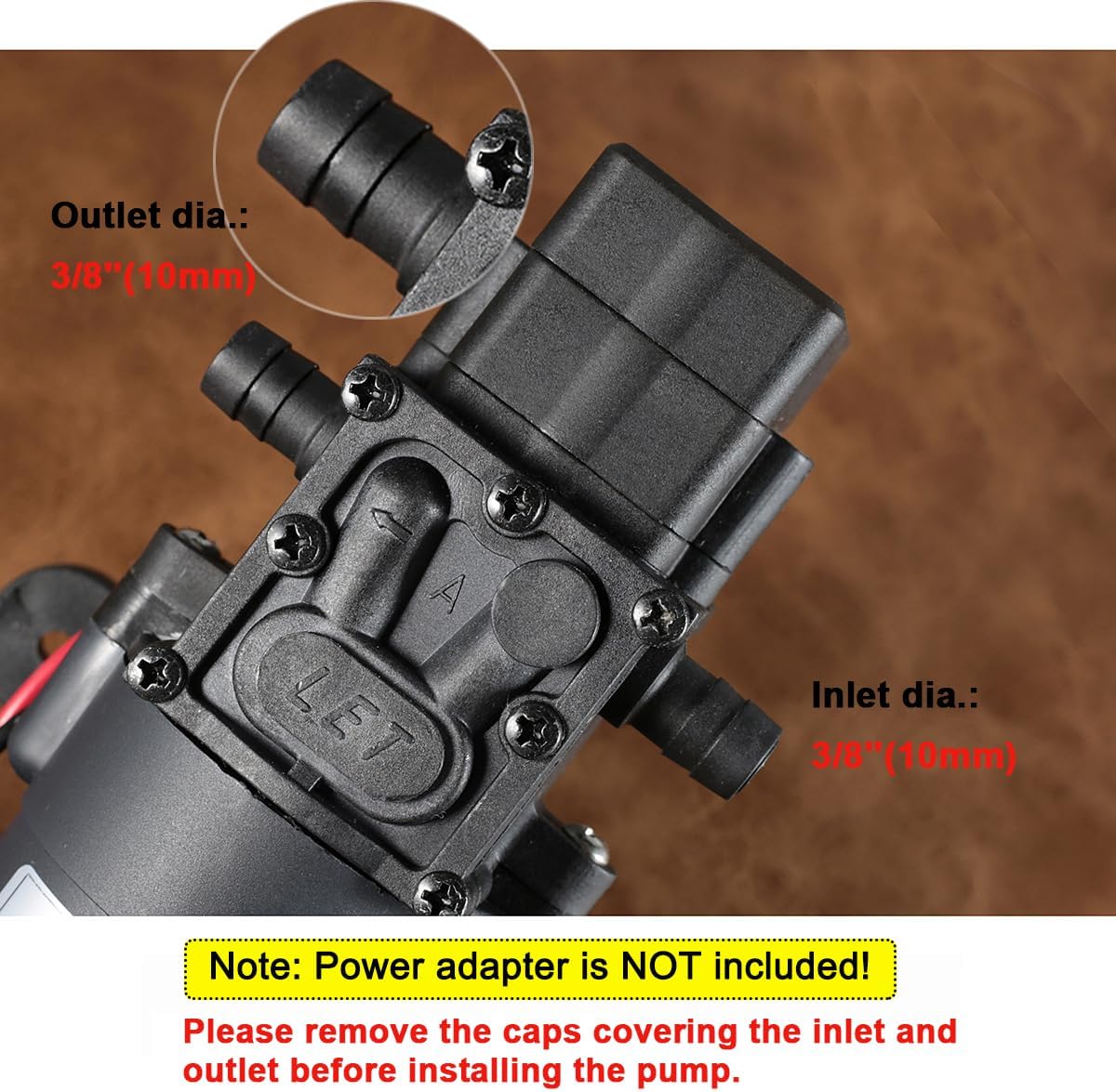 - Inlet and Outlet: 3/8-inch hose barb ports. Vertical Suction Lift: 6.6ft (2m). CUT-OFF Pressure: Default 80-85PSI. It doesn't mean 4.5L/min jet at 100PSI. Comes with 2 tube clamps. WARNINGS: DC 12V Power supply ONLY!! No AC power. Voltage OVER 14V can burn the motor.