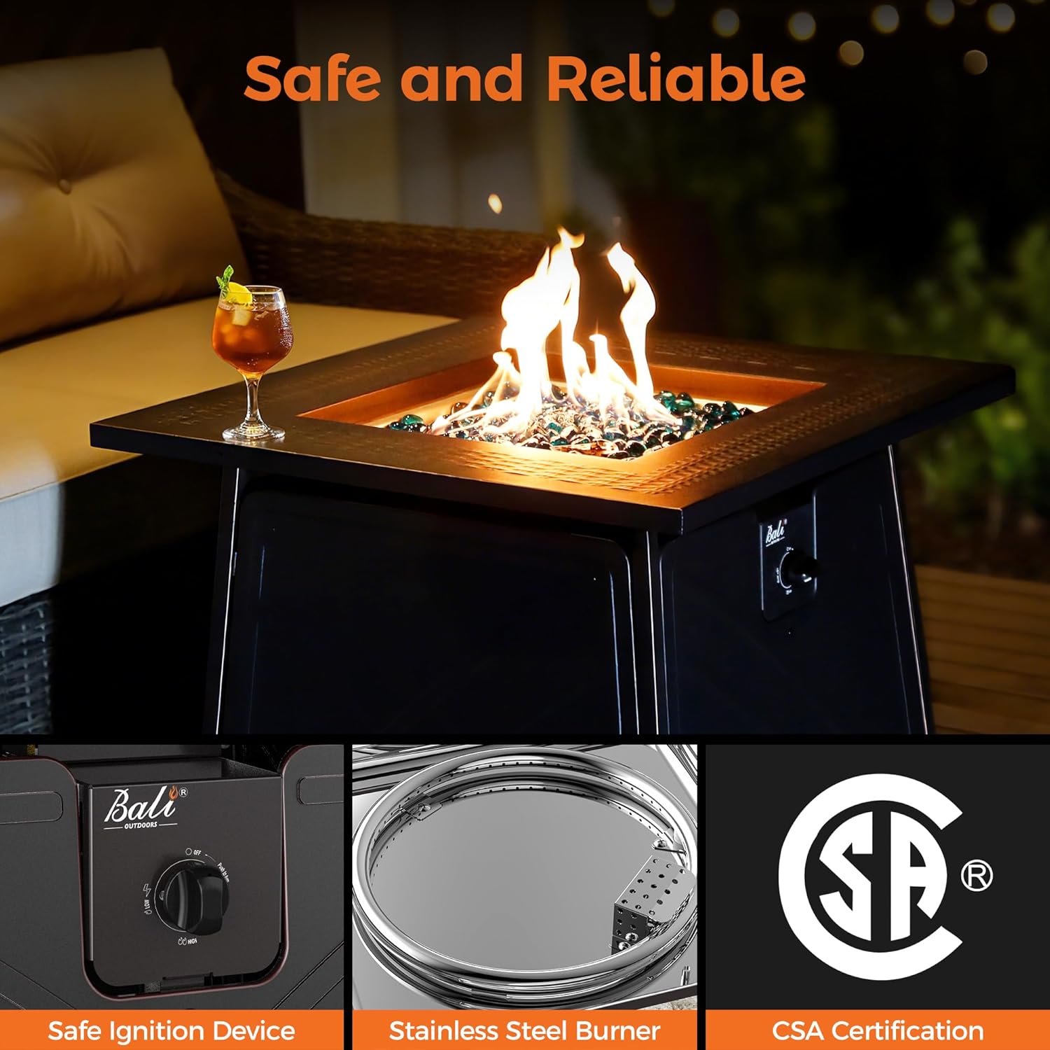 - SAFTY AND GREAT HEAT OUTPUT: Our gas fire pit table is 50,000 BTU heat output gives you enough heat to warm you up on cool morning and nights