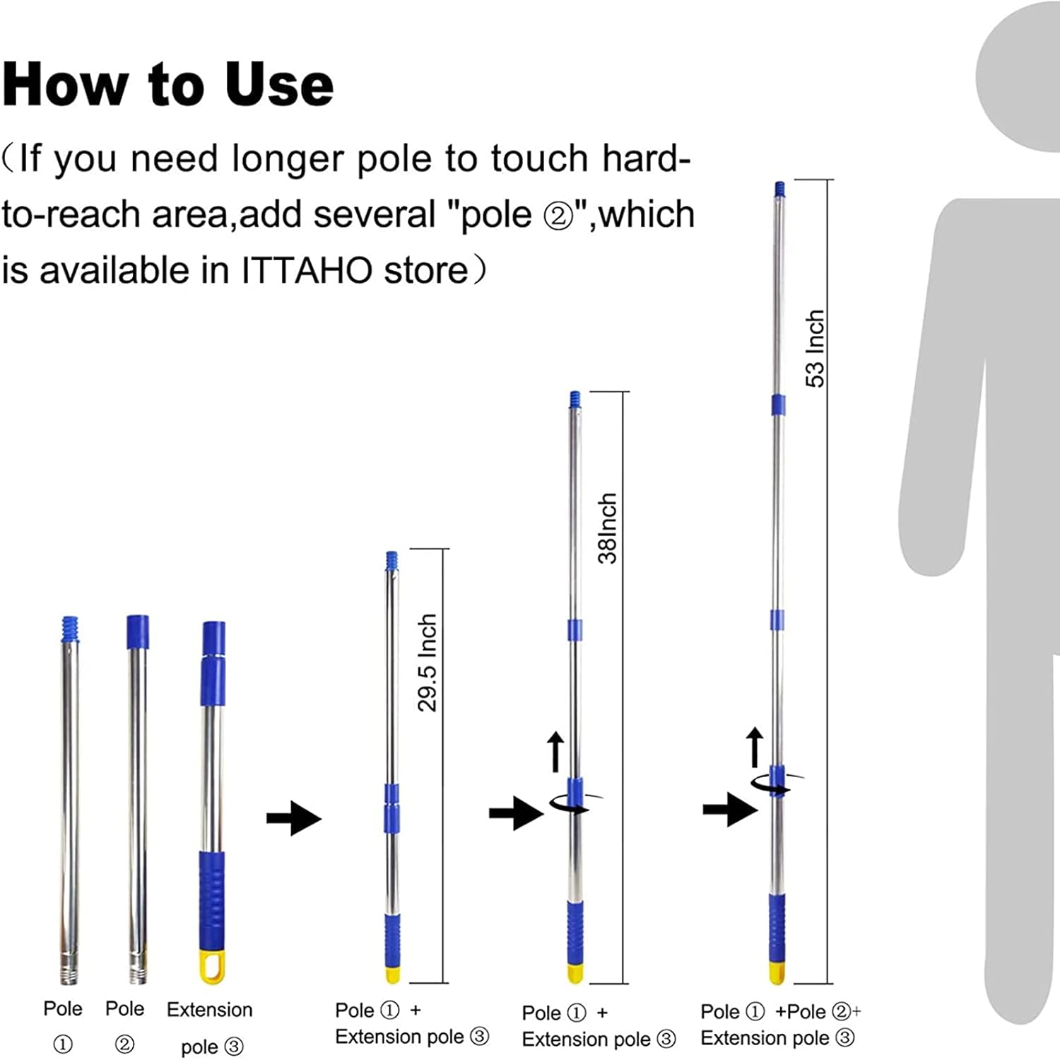 - 53 Inch Stainless Steel Pole: Desired household window washing kit with 3 section of extension poles, you can adjust the length according to your needs.Durable and sturdy stainless steel for hard cleaning work.All purpose squeegee for auto,car windshield glass,household high window cleaning,indoor and outdoor cleaning