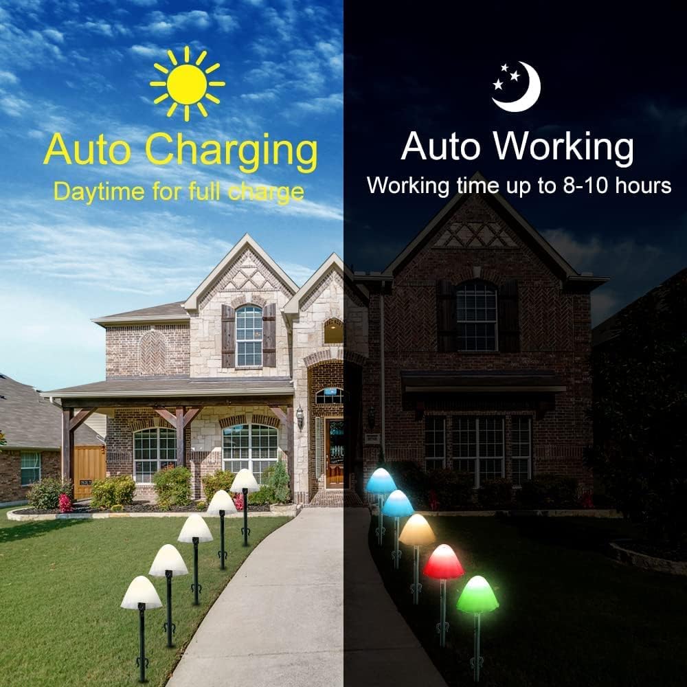 - 【Solar Garden Lights Outdoor】The solar mushroom pathway lights are charging by solar panel. Only need to place the solar panel in the full sunlight when it need to charge. At the first time, it will take 2-3 days to get full charging during sunny days. These mushroom light automatically charge during the day and automatically glow at night.