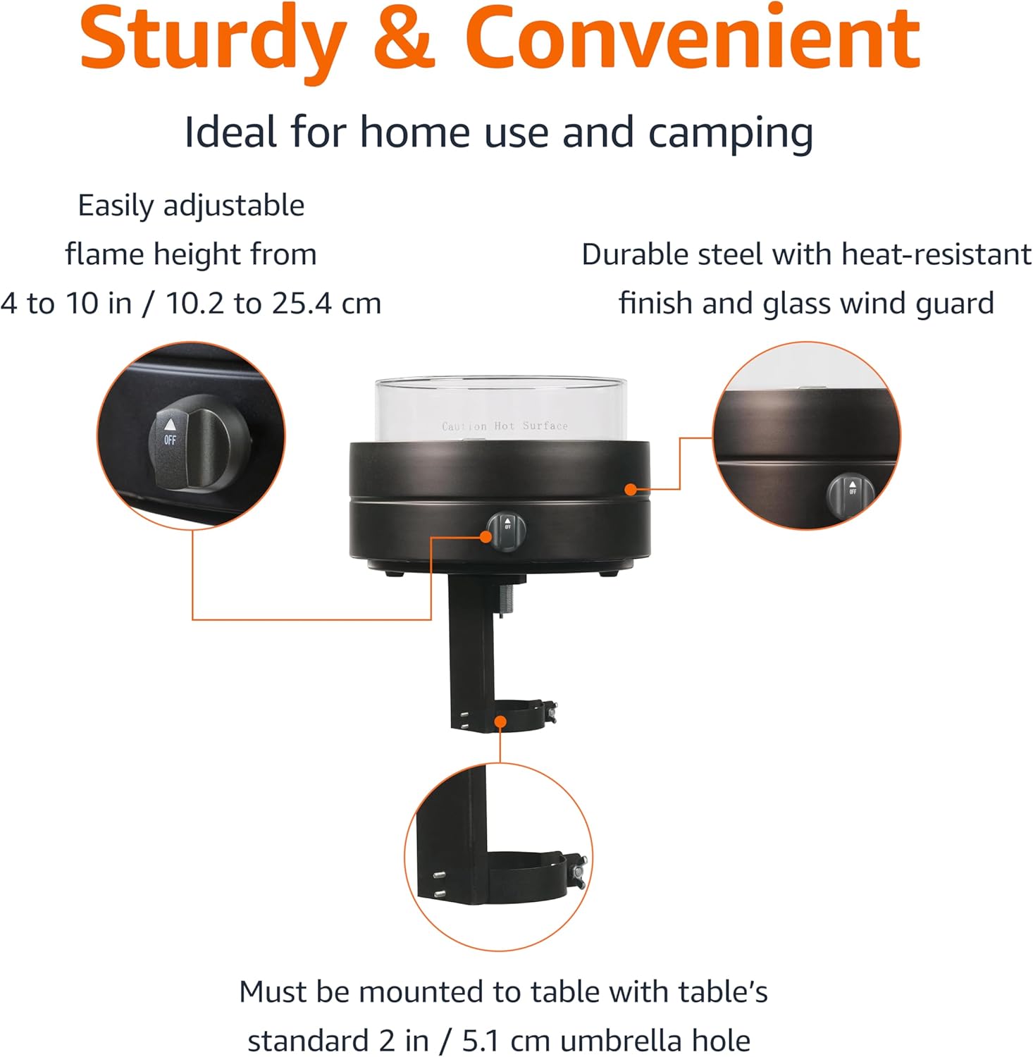 - Easily adjustable flame height from about 4 to 10 inches
