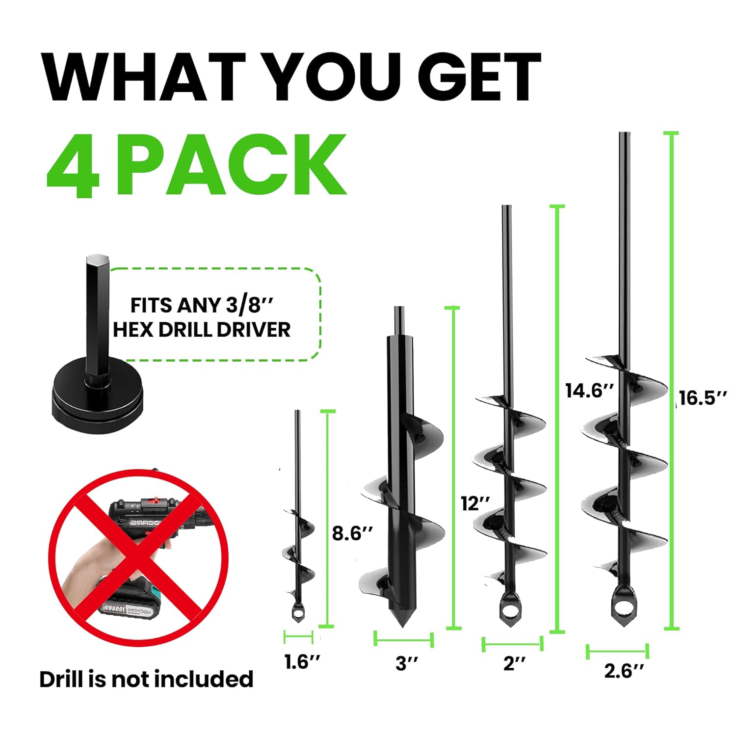 - Diverse Drill Sizes for Every Task: Our set includes 1.6 x 8.6 inches for precise planting, 3 x 12 inches for wider holes, 2 x 14.5 inches for horizontal drilling, and 2.6 x 16.5 inches for deeper excavations. With 3/8 inch non-slip drives, these augers are the ideal companions for all your yard digging needs!
