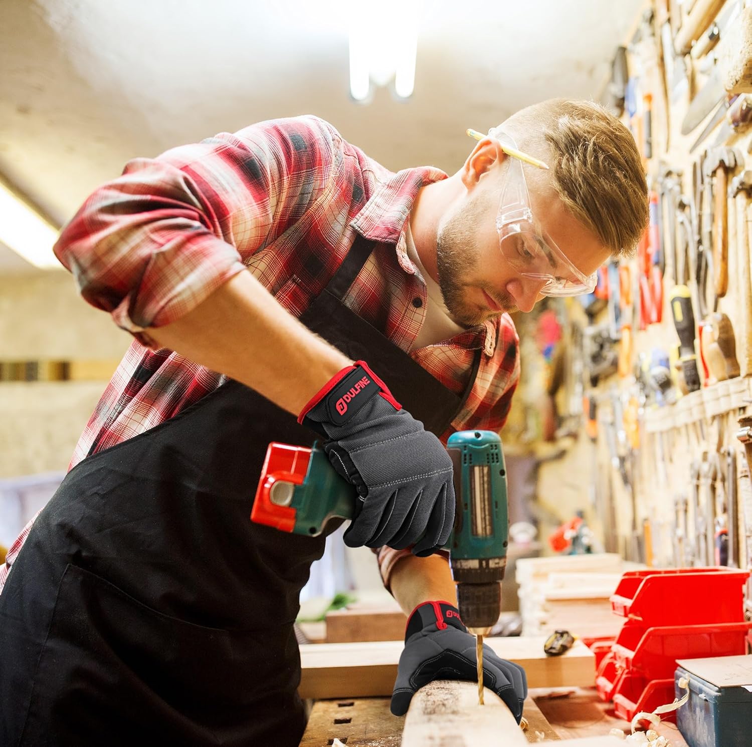 DULFINE Flex Grip Mechanic Work Gloves for Men,Black and Red Utility Safety Working Gloves Touch Screen,Excellent Grip,Ideal for Working on Cars and Outdoor Jobs(Medium)