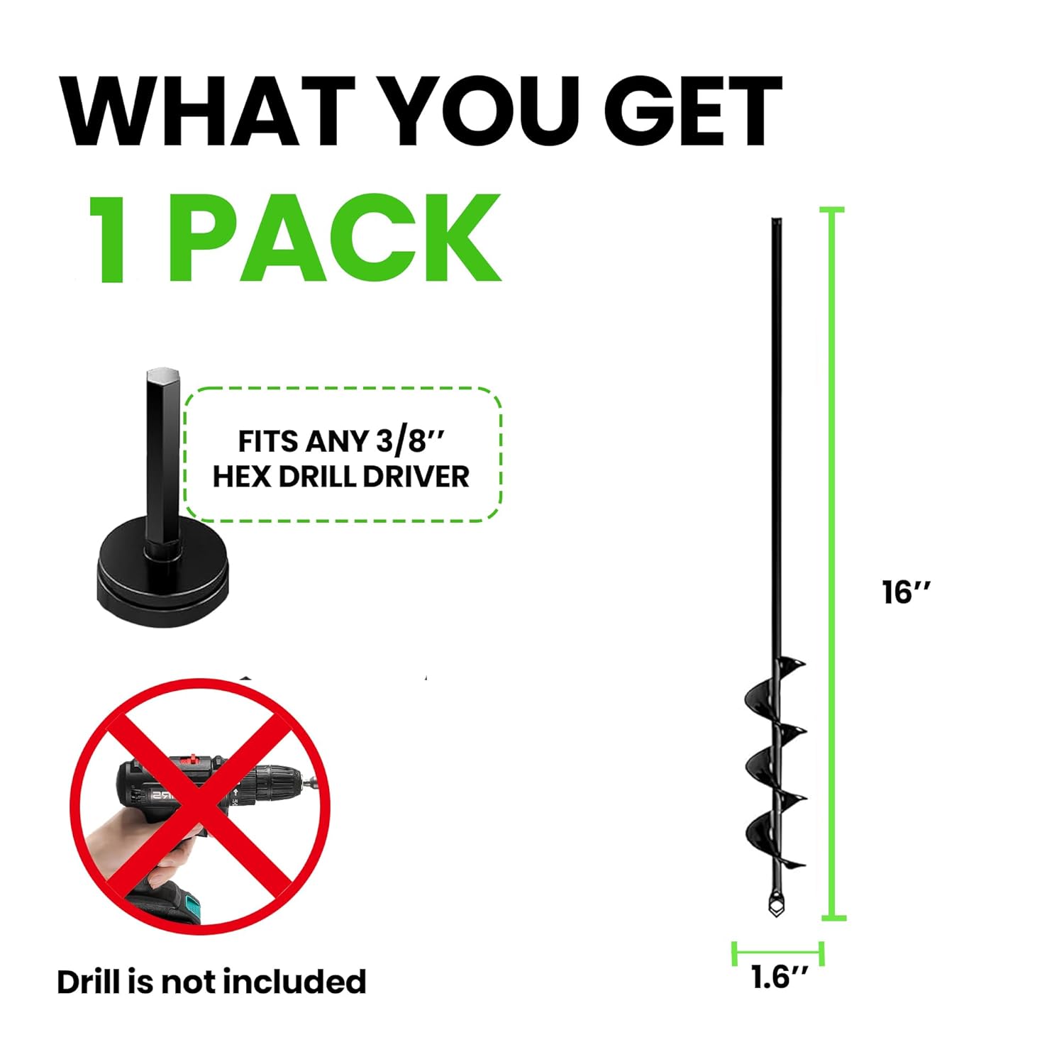 - Includes 1 Inch x 16 Inch Auger Drill Bit (Drill Not Included): Experience effortless digging with our high-quality auger drill bit! Simply attach it to any standard 3/8” hex bit drill, hold with both hands, and enjoy the ease of creating perfect postholes by digging down smoothly and reversing the drill to pull the soil back up