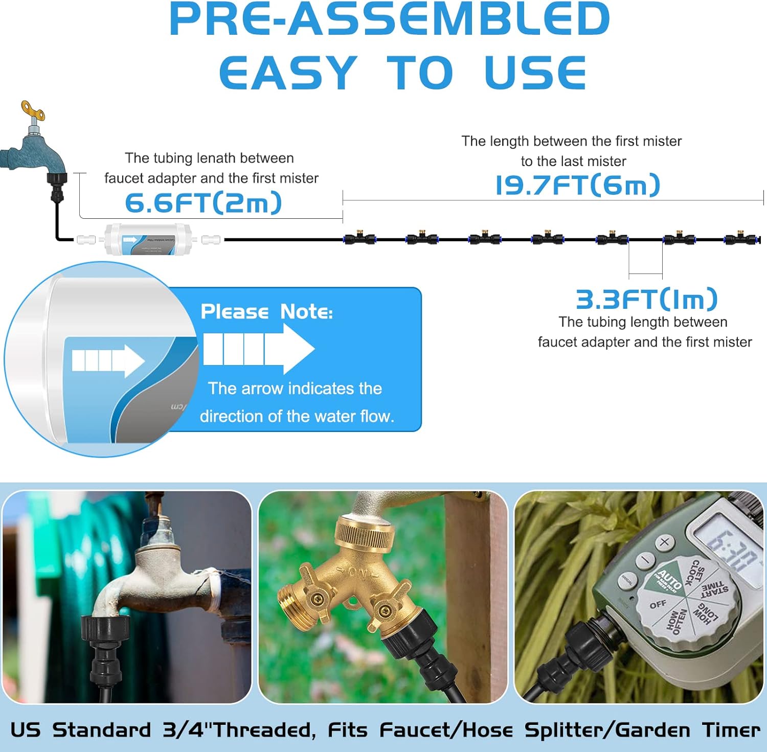 - EASY TO INSTALL - This misting system is completely pre-assembled, our US standard 3/4" adapter widely adapted to garden connectors, outdoor faucets, hose diverter, etc. Just connect it to the faucet and it works. Accessories and user manuals available, your misting ideas can be realized in just a few minutes.