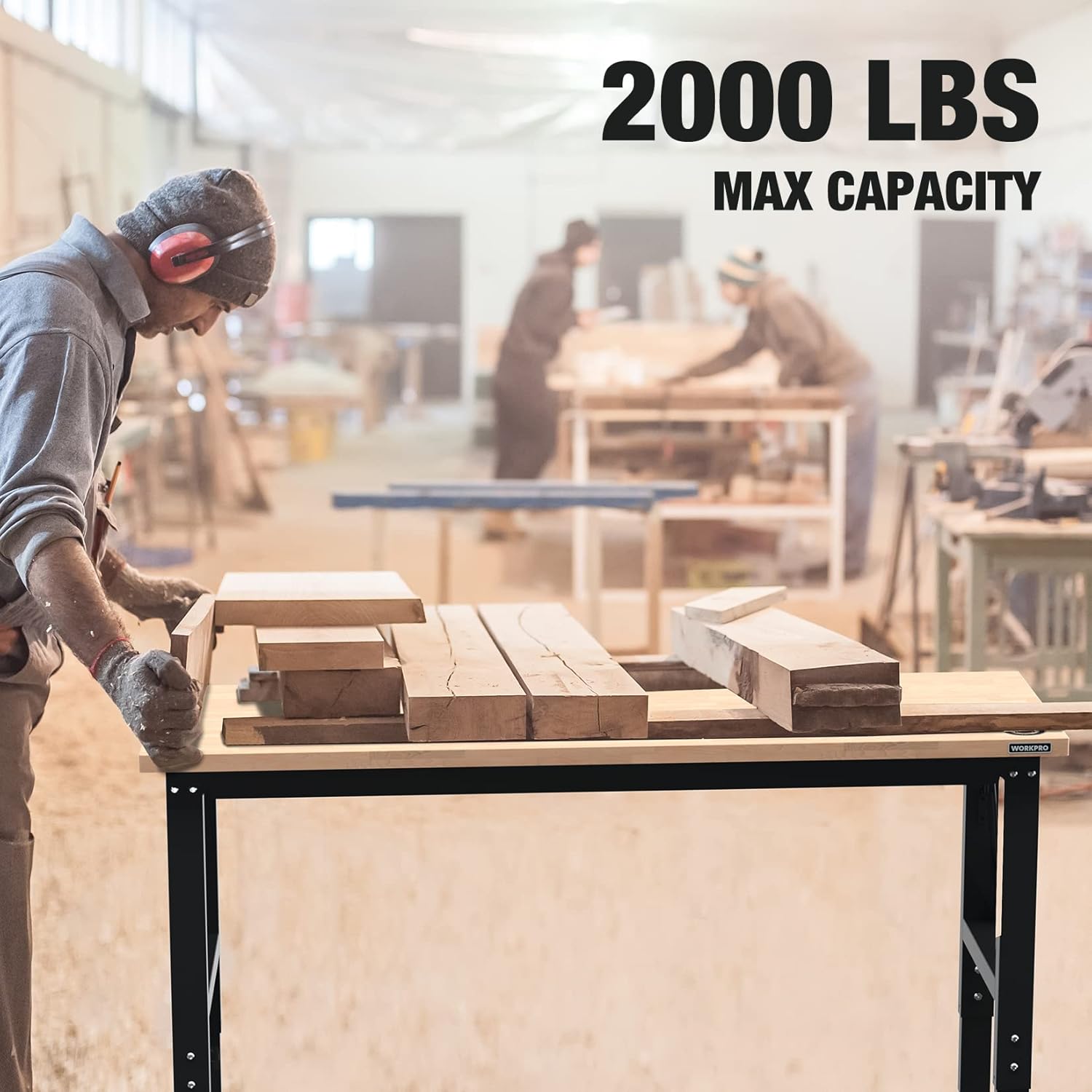 WORKPRO 60" Adjustable Workbench, Rubber Wood Top Heavy-Duty Workstation, 2000 LBS Load Capacity Hardwood Worktable with Power Outlets, for Workshop, Garage, Pack of 2