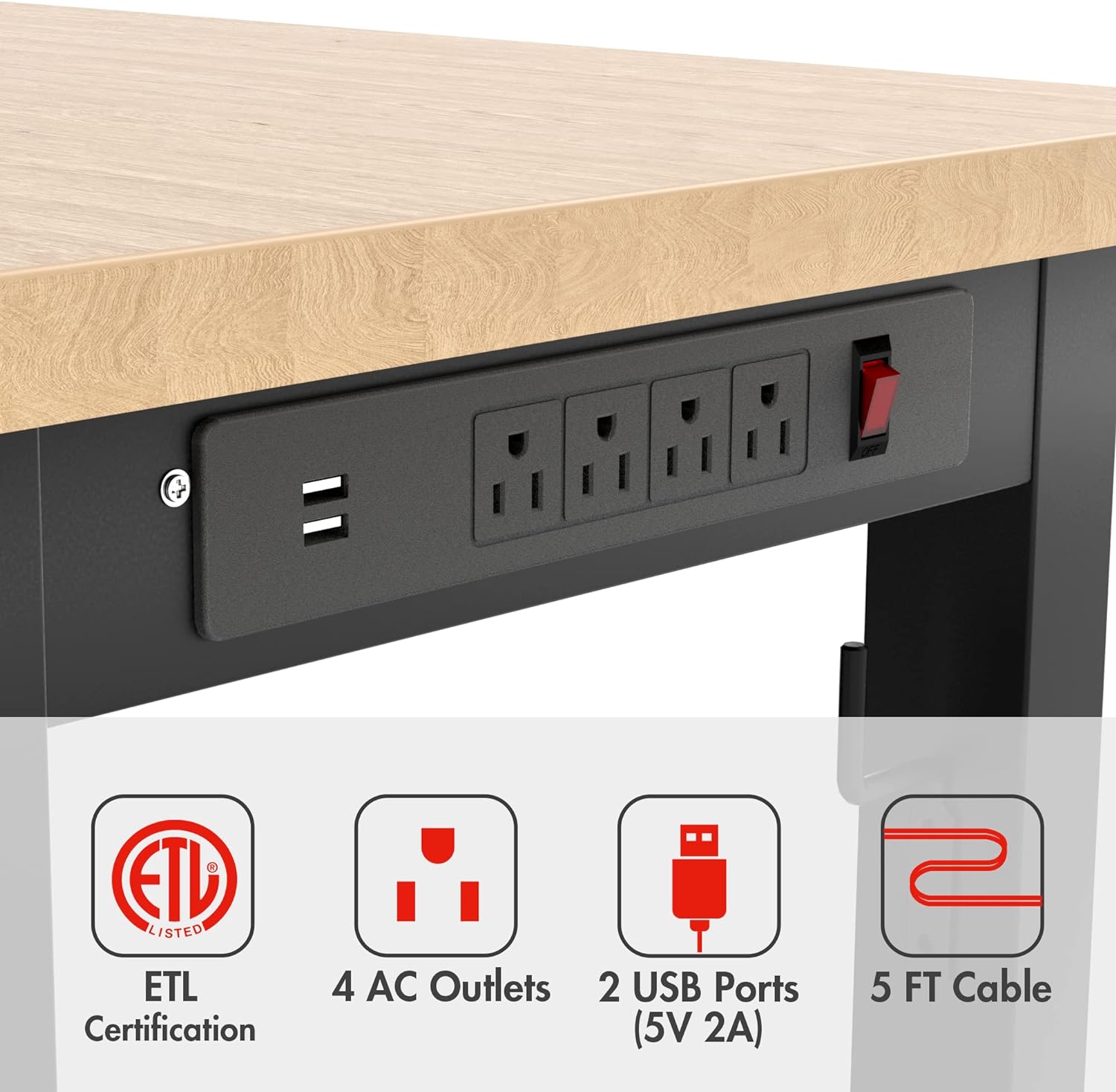 - ETL Certification Power Strip: We fitted a power outlet for the workbench.Convenient for you to use a variety of power tools and lamps. There are 4 AC Outlets and 2 USB-A ports on the power strip. And the socket is ETL certified for safety and durability.