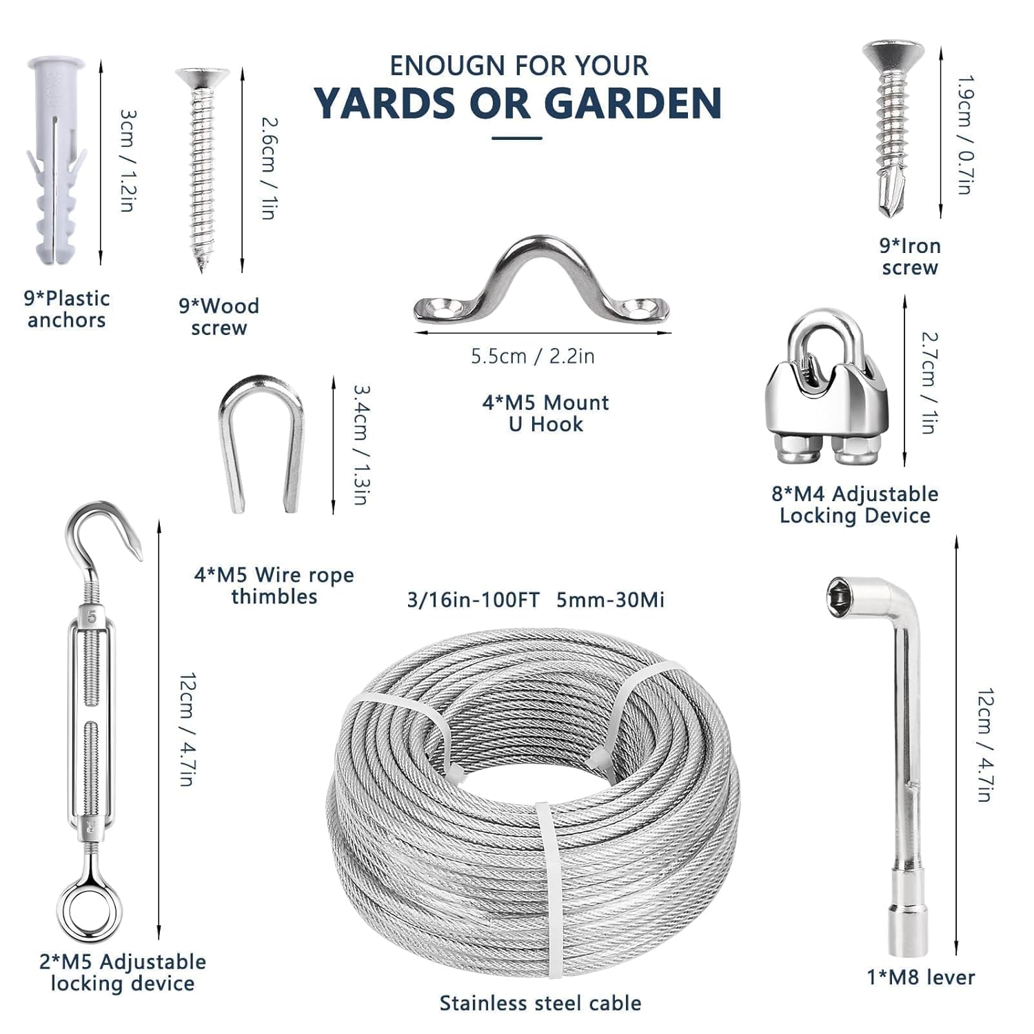 - Complete 3/16" Wire Rope Kit: 100ft 3/16 vinyl coated wire rope, 2 M5 turnbuckles for cables wire, 8 M4 wire rope clamps, 4 M5 thimbles, 4 M5 Mount U Hook, 9 Iron Screws, 9 Wood Screws, 9 Plastic Anchors, 1 M8 Wrench. Perfect for DIYers needing reliable solutions for anchored shed, fencing, sunshade