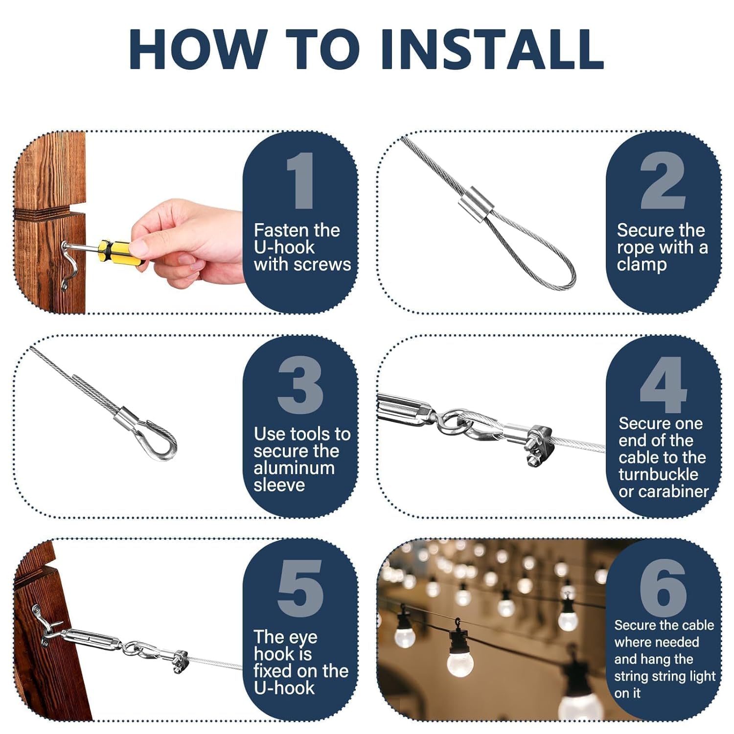 - Multipurpose Teniosner Wire Kit: The 3/16 cable tensioner kit is ideal for a variety of heavy-duty suspension applications, including string light hanging kit, garden wire system, wire curtain hanging system, chain link fence tensioning, cable railing kit, clotheslines, anti sag gate kit, fence wire, or building DIY railings, shade sails, and more (plastic anchors are suitable for concrete/brick walls)