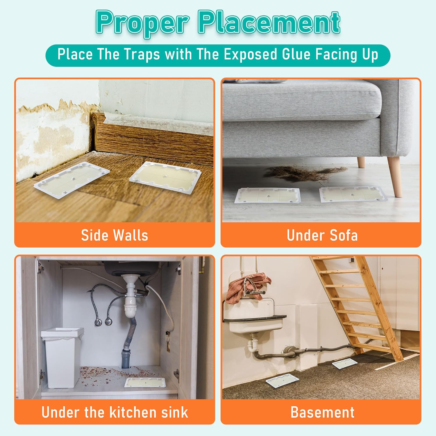 - Pest and Mouse Sticky Traps: sticky traps for mice can catch not only mice but also other common pests in your home, and we suggest you position sticky traps along active rodent runways, such as along walls, under large kitchen appliances, in cupboards, and other areas where rodents travel, be sure to fit the glue trap flush against a wall where rodents will run over and stick to it; And cold weather Qualirey glue traps for mice and rats can withstand 0° Fahrenheit weather