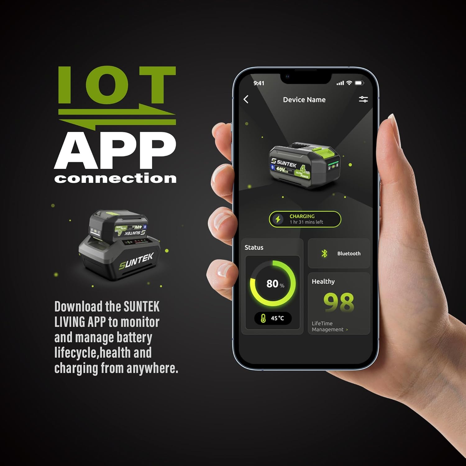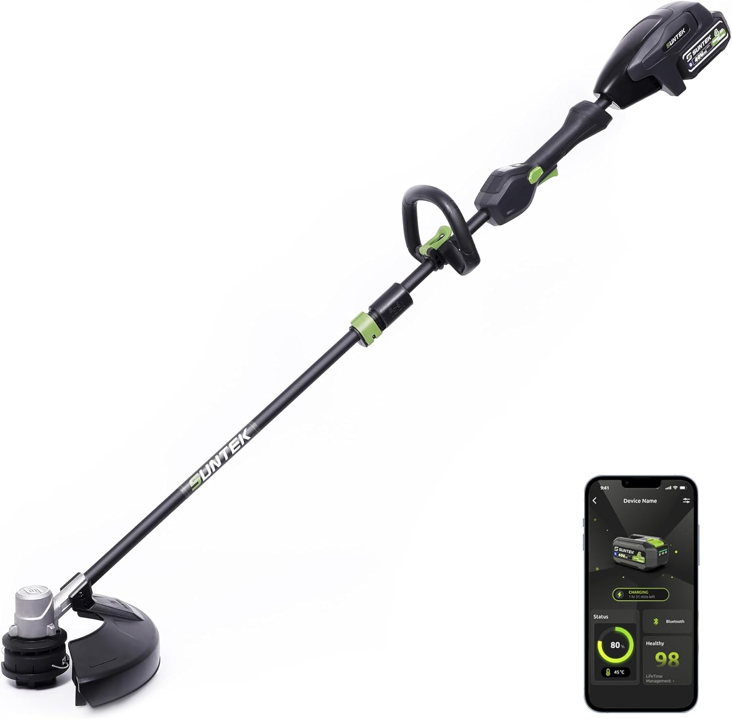 - Smart IOT & APP Connectivity - Improve your grass-trimming experience with the Suntek APP. Conveniently monitor and control your battery remotely, including battery management and charge scheduling. This IoT-enabled feature ensures your tool is ready whenever you are, enhancing convenience and usability.