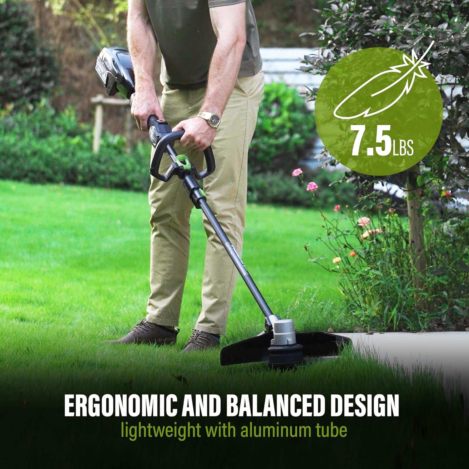 - More Ergonomic - The tool-free adjustable front handle adheres to ergonomic design principles, catering to various weeding angles and alleviating arm pressure for users. With 2-speed working modes (Eco and Power), it enhances power for more robust performance or extends the running time. This trimmer is designed to meet diverse lawn care needs and adapt to different grass conditions.