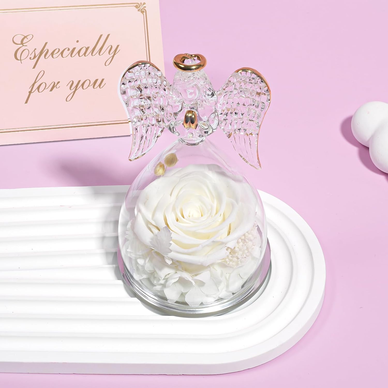 Yamonic Birthday Gifts for Women, Angel Figurines with Real Rose Gifts for Her Mom Grandma,Preserved Flowers Rose Angel Figurines for Mothers Day Christmas Anniversary Birthday Gifts for Her (White)