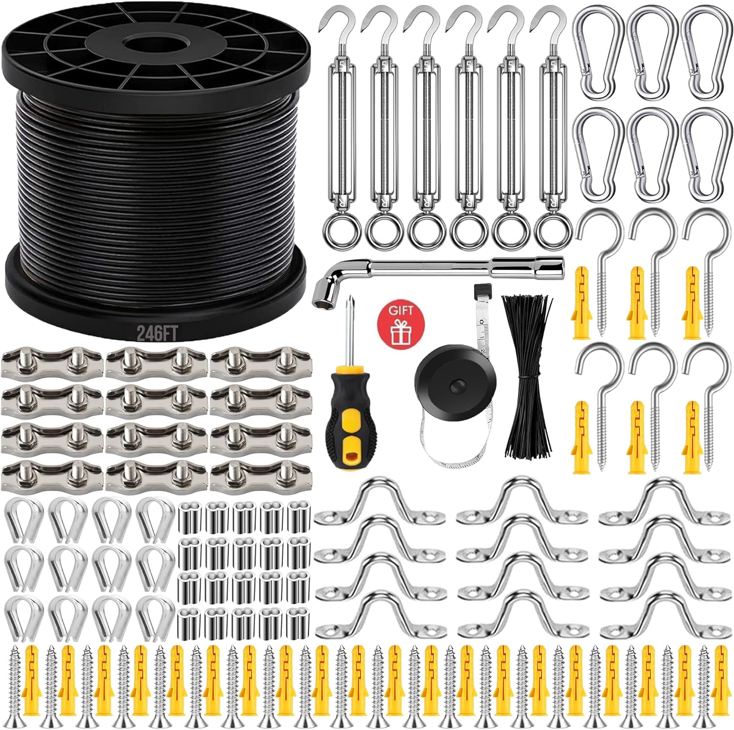 - 【Outdoor String Lights Hanging Kit 】:1x 246 FT Stainless Steel Cable,6x Turnbuckles,6x Snap hook carabiners,12x Eye Straps,24x Screws,30x Plastic Anchor,12x Double Rope Clamps,20X Aluminum Crimping Sleeve.6x Screw Hooks 𝐆𝐢𝐟𝐭 𝐏𝐚𝐜𝐤𝐚𝐠𝐞 𝐋𝐢𝐬𝐭:1x Socket Wrench,1x Crossscrew Driver,1x Tape Measure,Approx. 50 pieces of twisted tape (for fixing string light)
