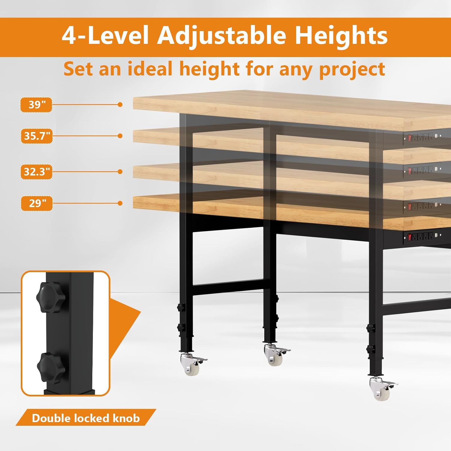 60" Adjustable Height Workbench with Wheels, Heavy-Duty Solid Wood Work Table with Power Outlets, 2000 LBS Capacity Workstation for Garage, Workshop(60" X 24")
