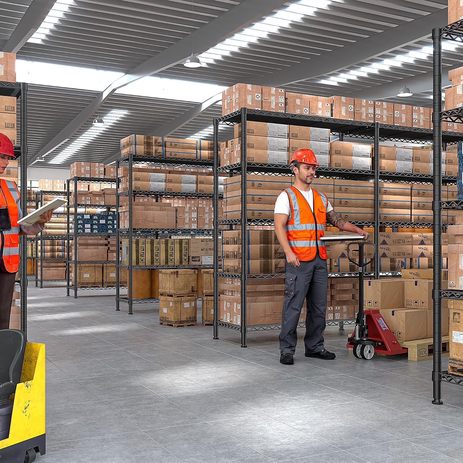 - ăAdjustable Wire Shelving Rack for Different HeightsăThe height of each wire shelf on the garage storage shelves can be adjusted freely according to the height of your heavy-duty items, accommodating items of any height.