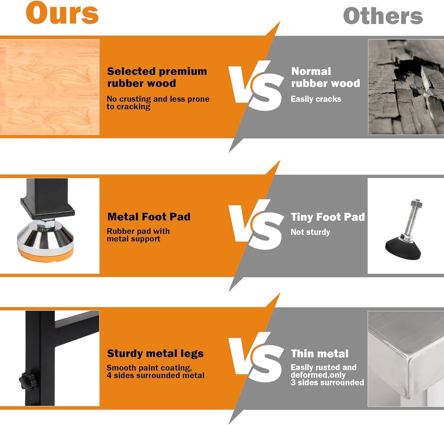 - Adjustable Non-slip Foot Pad: Each leg of the work bench is equipped with an adjustable rubber non-slip foot pad, so when the ground is uneven, you can freely adjust it properly to keep desktop horizontal