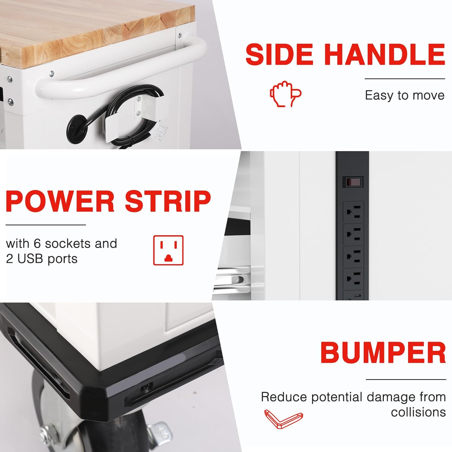 - Convenient Power Strip: The power strip integrated into the rolling tool chest is ETL and DOE certified, featuring 6 outlets and 2 USB ports, along with a 1.5-meter power cord. It's specifically designed to meet the power needs of garages, warehouses, workshops, and homes. Whether you're a professional technician, a DIY enthusiast, or a hobbyist, it provides practical and convenient power for your tools, significantly enhancing overall efficiency and convenience.