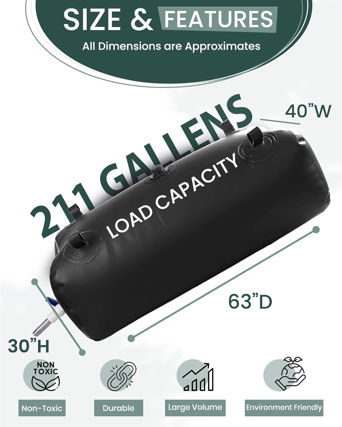 - LARGE CAPACITY: There are five different sizes to choose from, with a maximum water storage capacity of 264 gallons. The different sizes of water storage bags will allow you to be outdoors and not have to worry about running out of water.