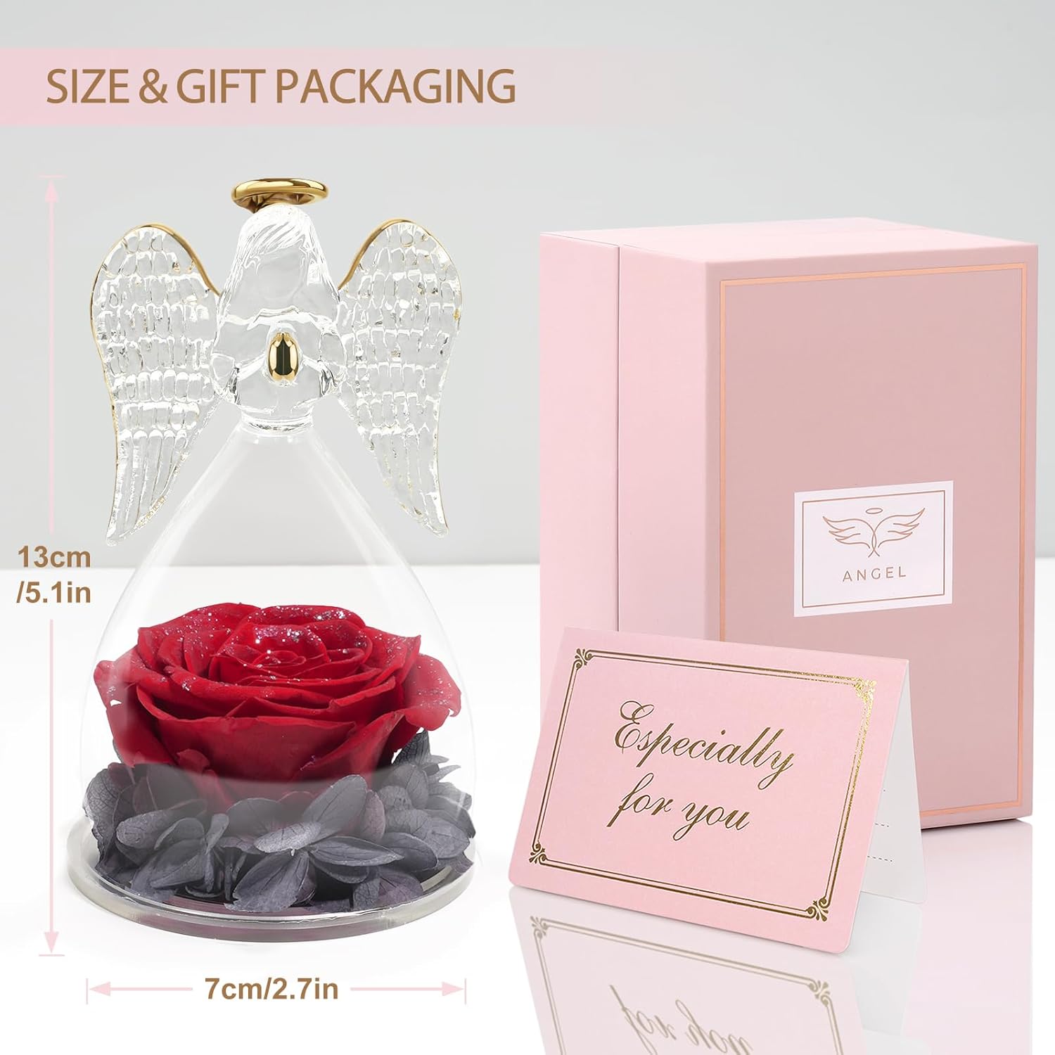 - The package contains 1x Angels Rose, 1x Protection Gift Box and 1x Greeting card.