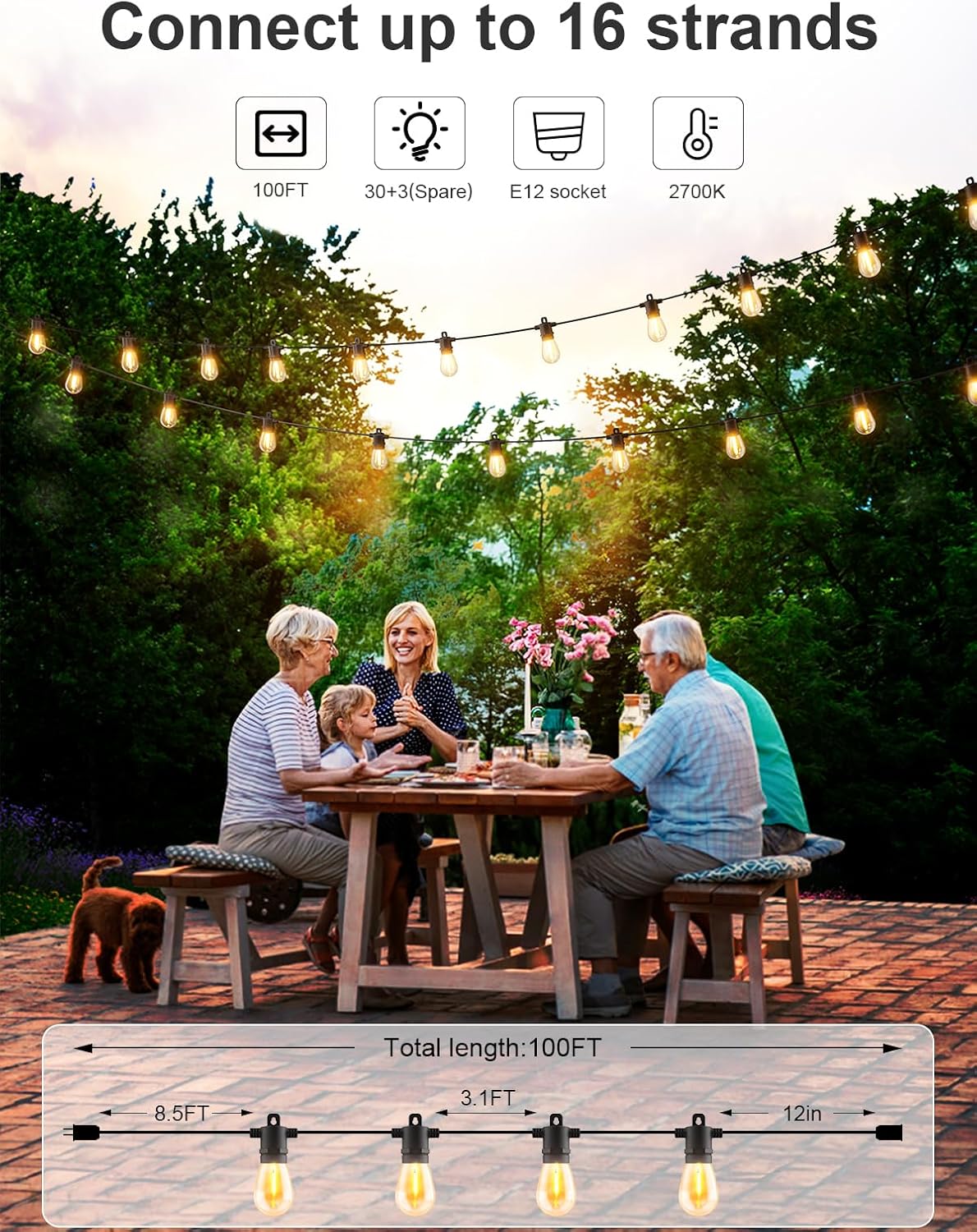 - Wide Application: Perfect for outdoor patio, cafe, bistro, backyard, yard, porch, gazebo, balcony, Outside, garden, party, wedding decoration. Connect up to 16 strands of 100FT string lights. Please contact us if you have any problem