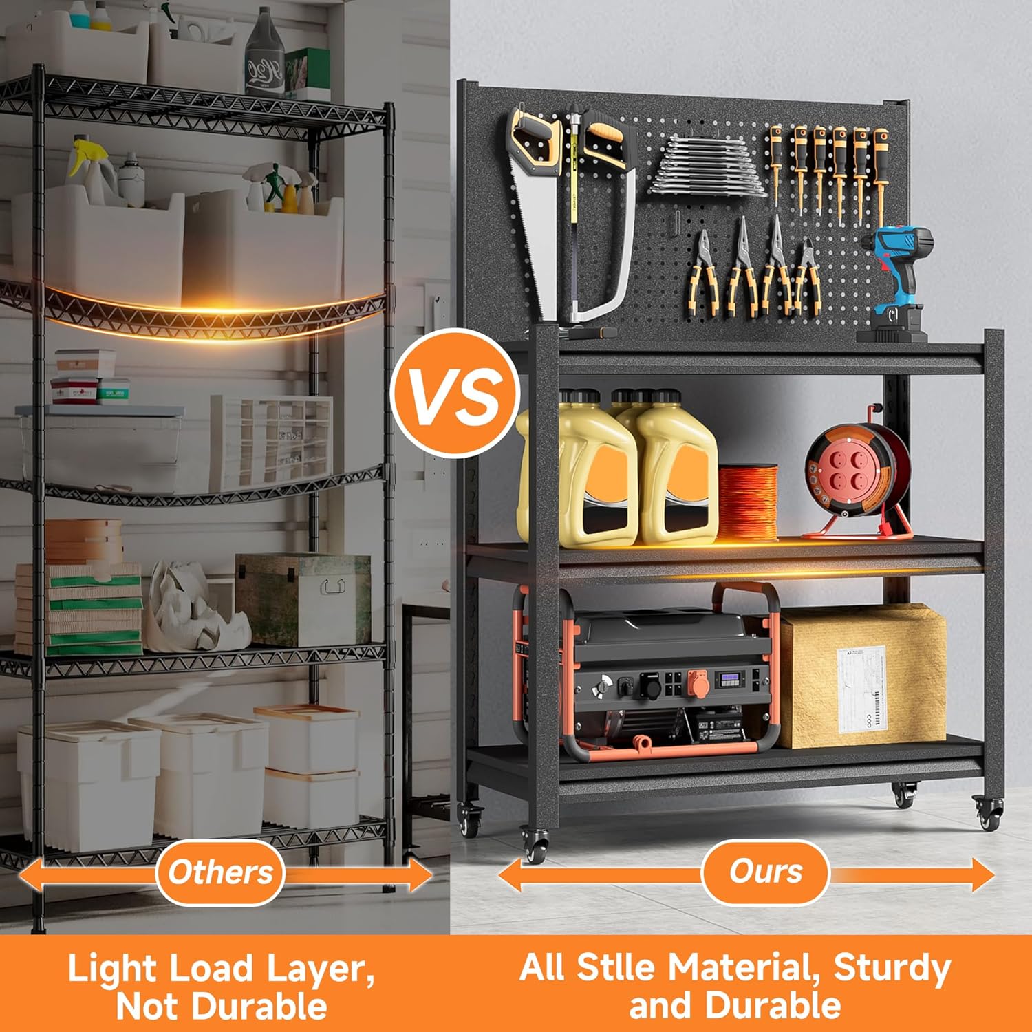 - 【Anti-Rust & Multi-Function】Optimized and upgraded metal workbench features a pegboard and 3-tier dividers. You can customize the shelf layout and use your imagination to customize your space. This workbench offers flexibility with its upgraded metal wheels. With four lockable wheels, effortlessly roll it around both indoor and outdoor spaces.