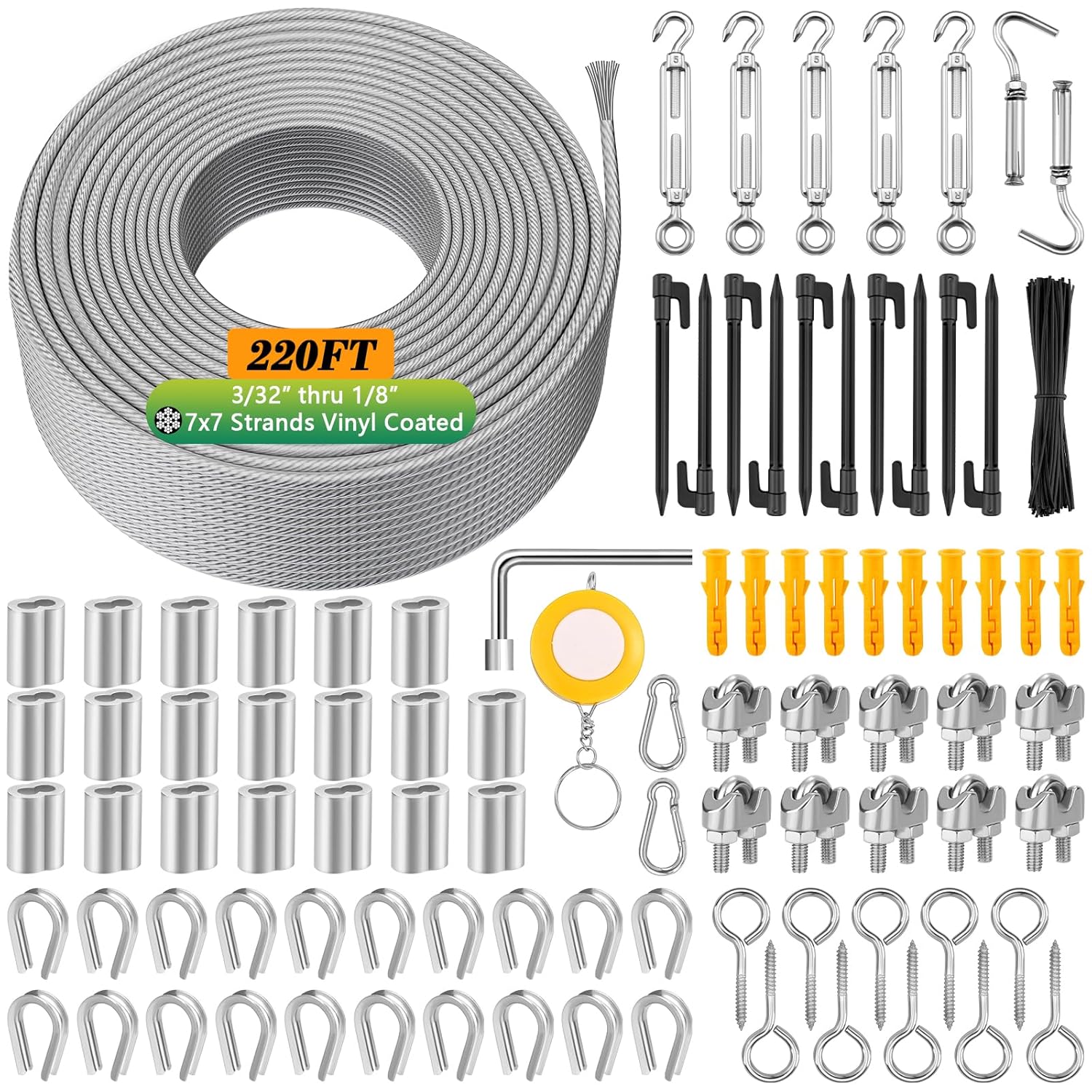 - [192 Pcs Steel Wire Cable Kit] Comkrivy steel cable kit offers more accessories than any other product. It comes with 220 FT 1/8 inch vinyl coated stainless steel cable wire, 20 M3 thimble, 20 M3 aluminum sleeve, 10 M3 wire rope cable clip clamp, 5 M5 turnbuckle tensioners, 2 M5 clips, 10 M5 sheep eye screw hook, 10 M5 plastic anchors, 2 M6 expansion hooks, 10 black tent pegs, 1 socket wrenches, 1 tape measure and 100 black twist ties to meet your different hanging and decoration needs