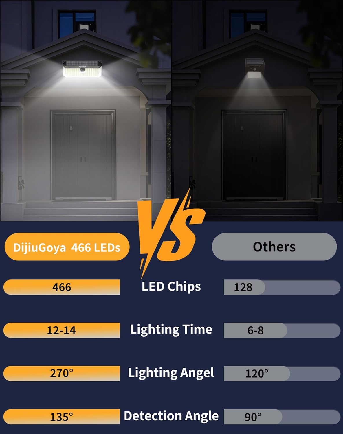 - 466 LEDs & 270° Wide-angle Lighting: Outdoor solar light is equipped with 466 ultra-bright LED lights, have better lighting effects. The 3-sides lighting design has a lighting wide-angle of up to 270°, which provides a wide lighting range, any potential threats can be clearly seen, making it ideal for enhancing the security of your property and surroundings