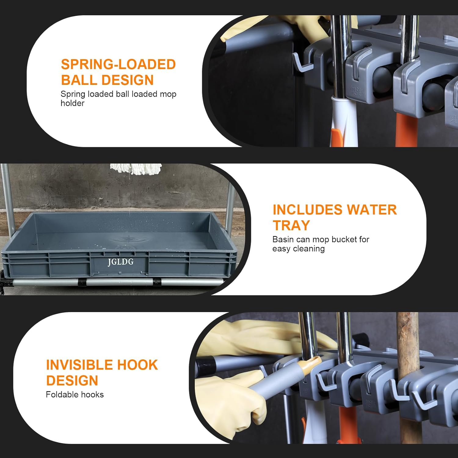 - 【Smart Water Tray】: The base of the cleaning storage rack includes a water tray. It collects moisture from wet mops and cloths, preventing floor damage.