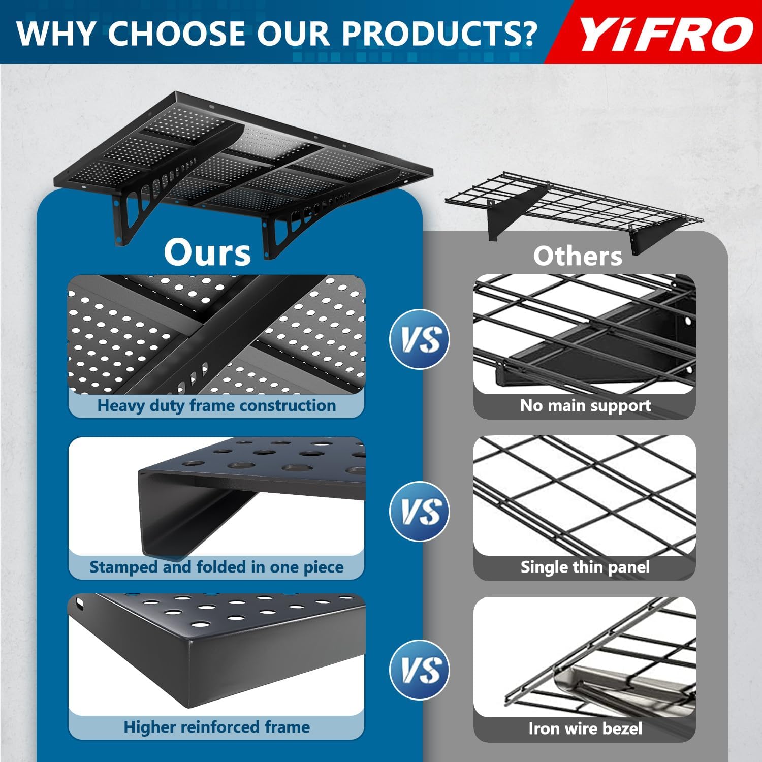 - HEAVY DUTY CONSTRUCTION: YIFRO garage wall shelving takes its cues from architectural frame construction, with a 1.5x4 ft individual bracket load capacity of 250 lbs. and a total of 1000 lbs. for 4 shelves, which makes it easy to store most of the items in your garage.