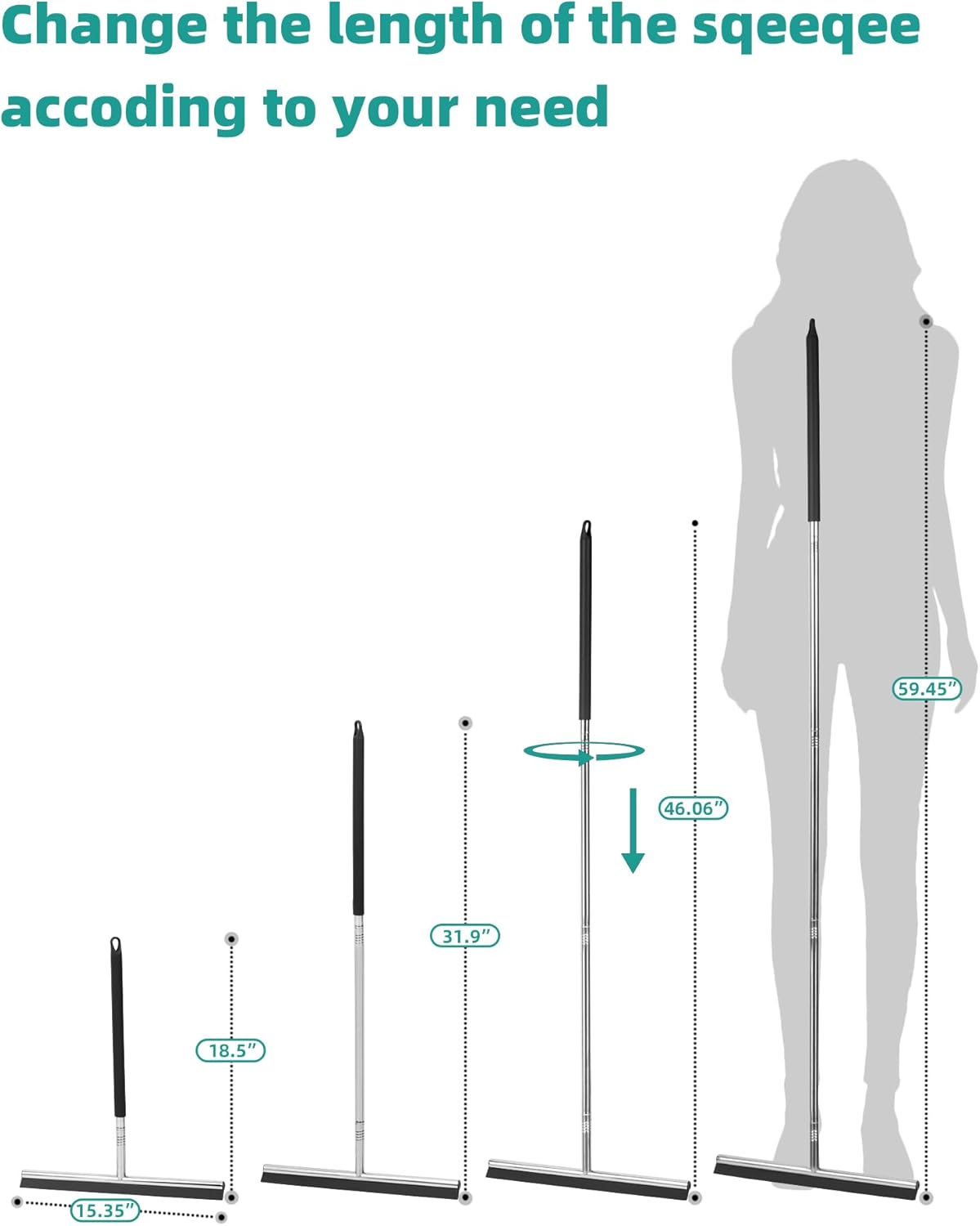 - 【No more bending while cleaning】:This rubber broom features a sturdy steel handle that can be adjusted in length from 18 inches to 59 inches by removing or adding sections, allowing you to clean easily without stressing your back, you can also easily reach windows or any high area to remove water and dirt. In addition, it has a hanging holes for easy storage.