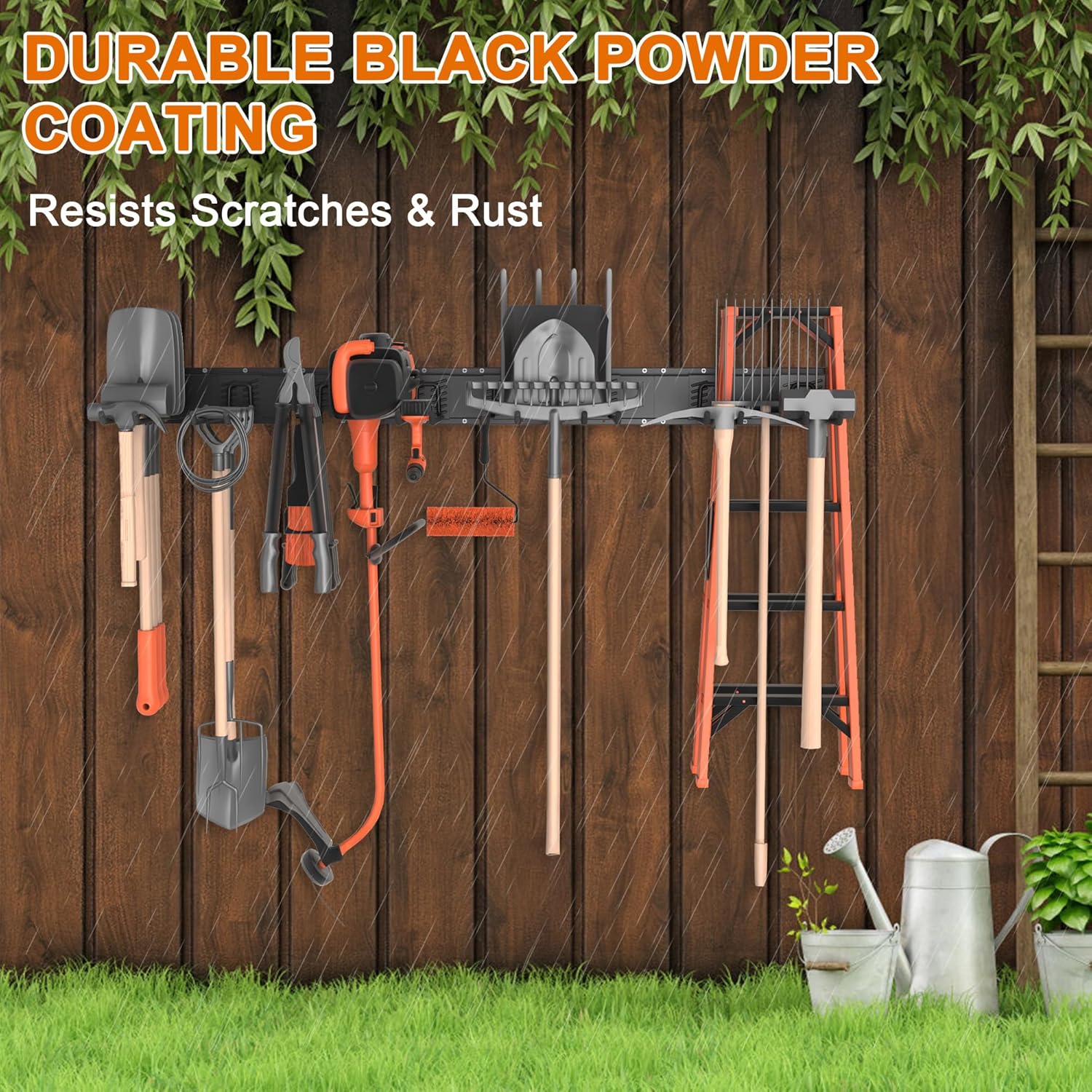 - [Wide Range of Application]: This garden tool rack wall mount is not limited to tools, it can also accommodate broom organization, hose cords, power tools, yard tools, sports equipment and other items; Whether in the garage, foyer storage, yard, garden, basement, tool shed, gym, home, shop, this tool storage rack is applicable