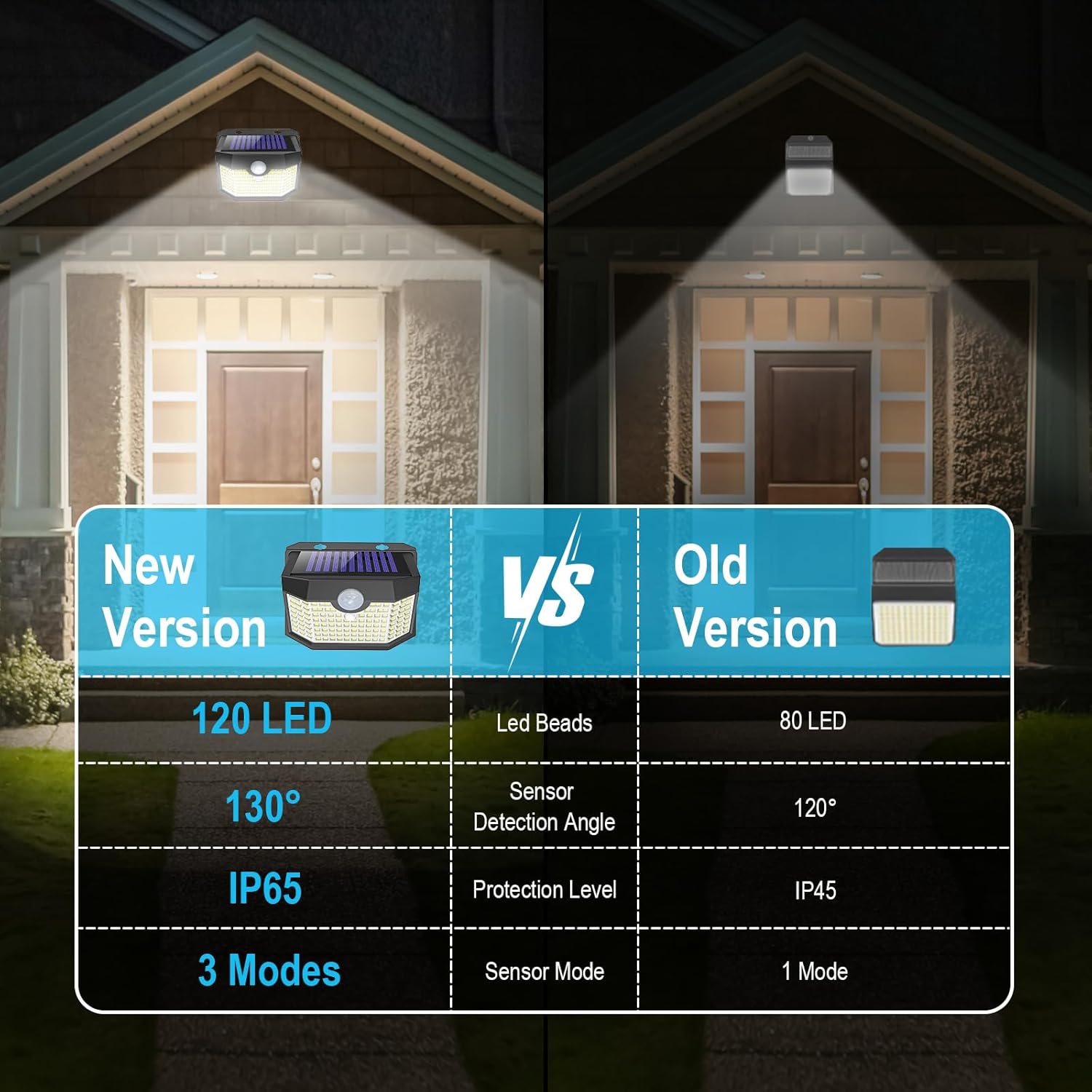- 【3 Optional Lighting Modes】The upgraded outdoor lights have 3 working modes to select: 1. Strong light sensor mode(Light is off when no movement,full bright for 25-30s when movement is detected) 2. Nomal light mode(Always Medium light for 8h) 3. Dim light sensor mode(Medium light when no movement, full bright for 25-30s when movement is detected).