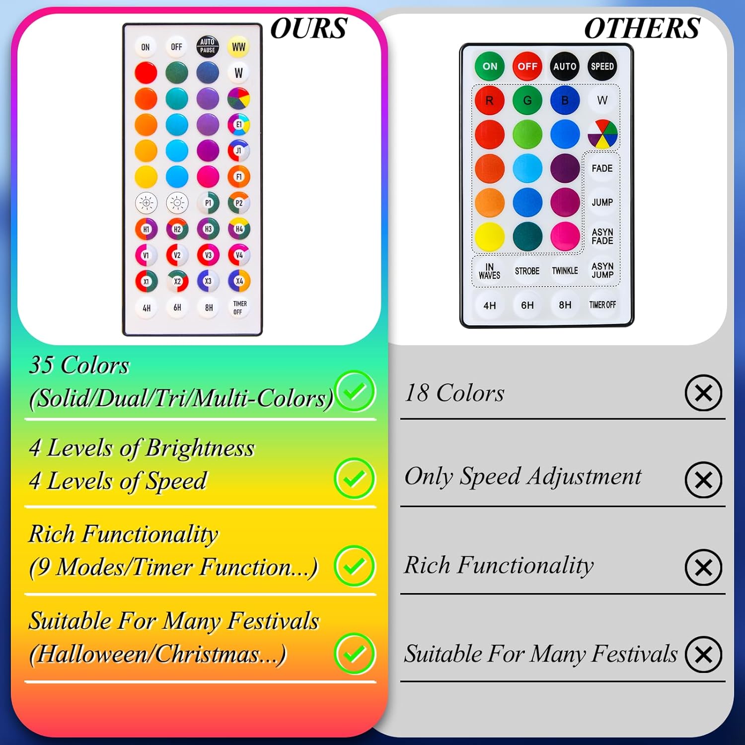 - UL Safety Adapter & Remote Control String Lights : UL-certified low-voltage adapter ensures safe operation. With a upgraded 44-keys wireless remote, press to change the color and lighting mode according to the different requirements. Notice: please aim the remote control at the UL adaptor while press the key. Simple and convenient humanized design, sufficient to meet your needs.