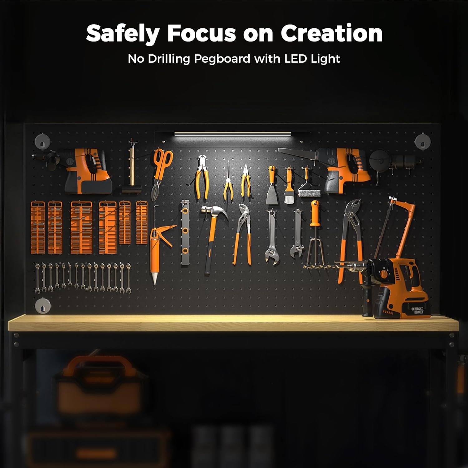 - [Safely focus on creation] ETL Certification Built-in Power Strip with buttons and convenient access to power tools. There are 4 AC outlets, 2 USB-A ports on the power strip with 6.5 FT cables. And the socket is ETL-certified for safety and durability. The LED Lighting fixed on the pegboard provides ample illumination for you in the dark, allowing you to enjoy focused moments anytime.