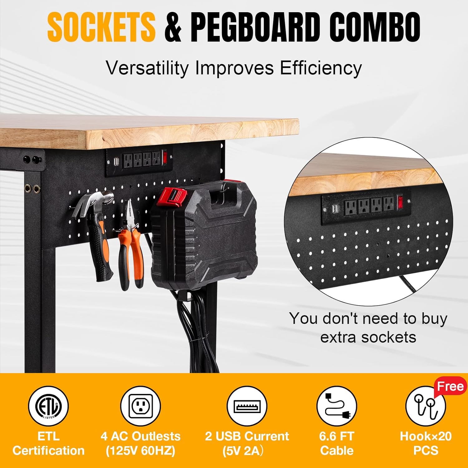 Height Adjustable Workbench Heavy Duty Work Table 2000 LBS Load Capacity 60”×22” Rubber Wood Work Station with Power Outlet & Pegboard for Garage, Workshop, Office,Party Shop, Home
