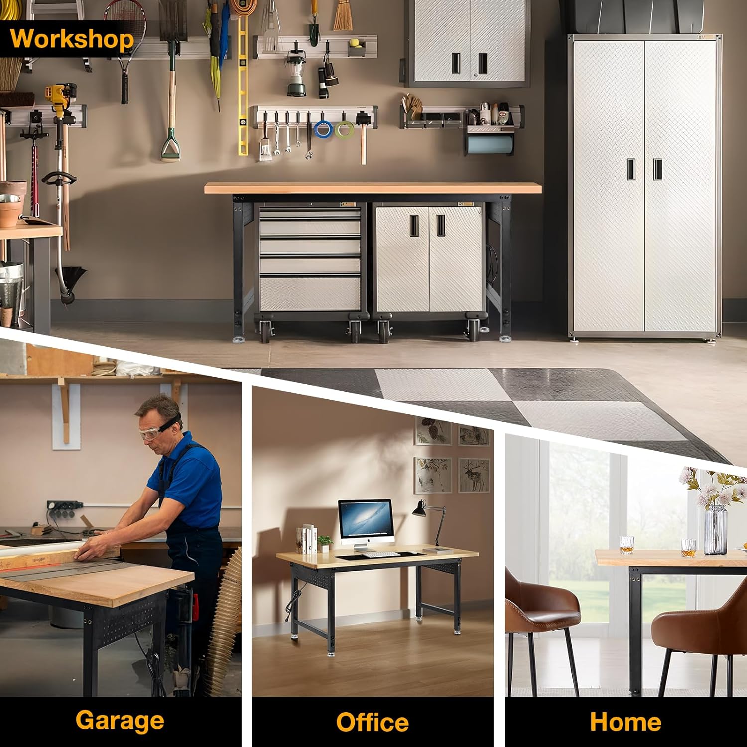 - SOLID RUBBER WOOD AND THICK STEEL: The tabletop is made of 60“ x 22” x 1.2” solid rubber wood. It is finely coated and polished for long life and easy cleaning. The steel is 1.3mm thick.Precision cutting process makes this workbench with 2000LBS weight capacity, ideal for auto repair projects and gardening.