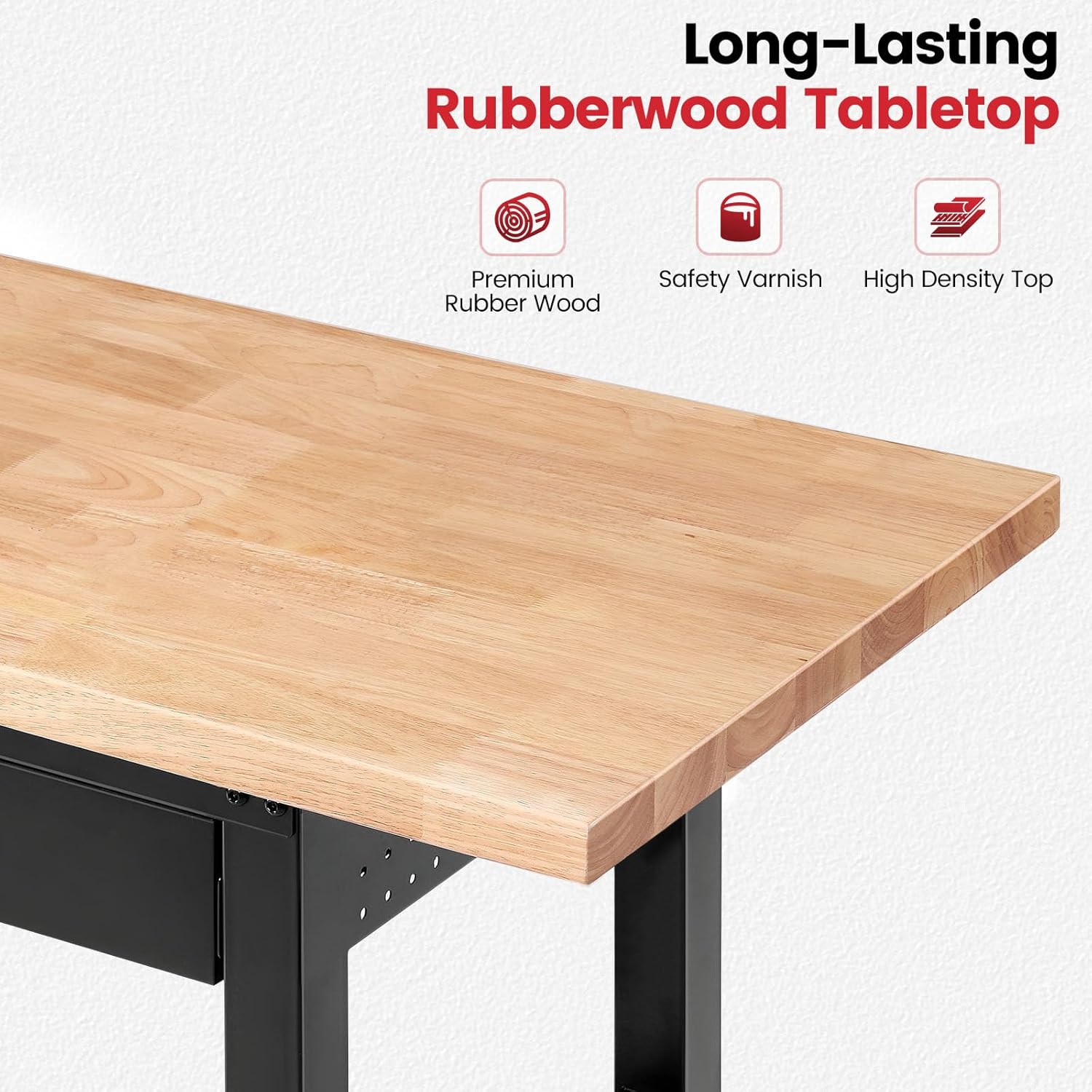 - Heavy Duty Rubberwood Tabletop: 30mm solid rubberwood tabletop supports up to 2000 lbs, perfect for heavy tools and materials. Protective safety varnish ensures long-lasting durability.