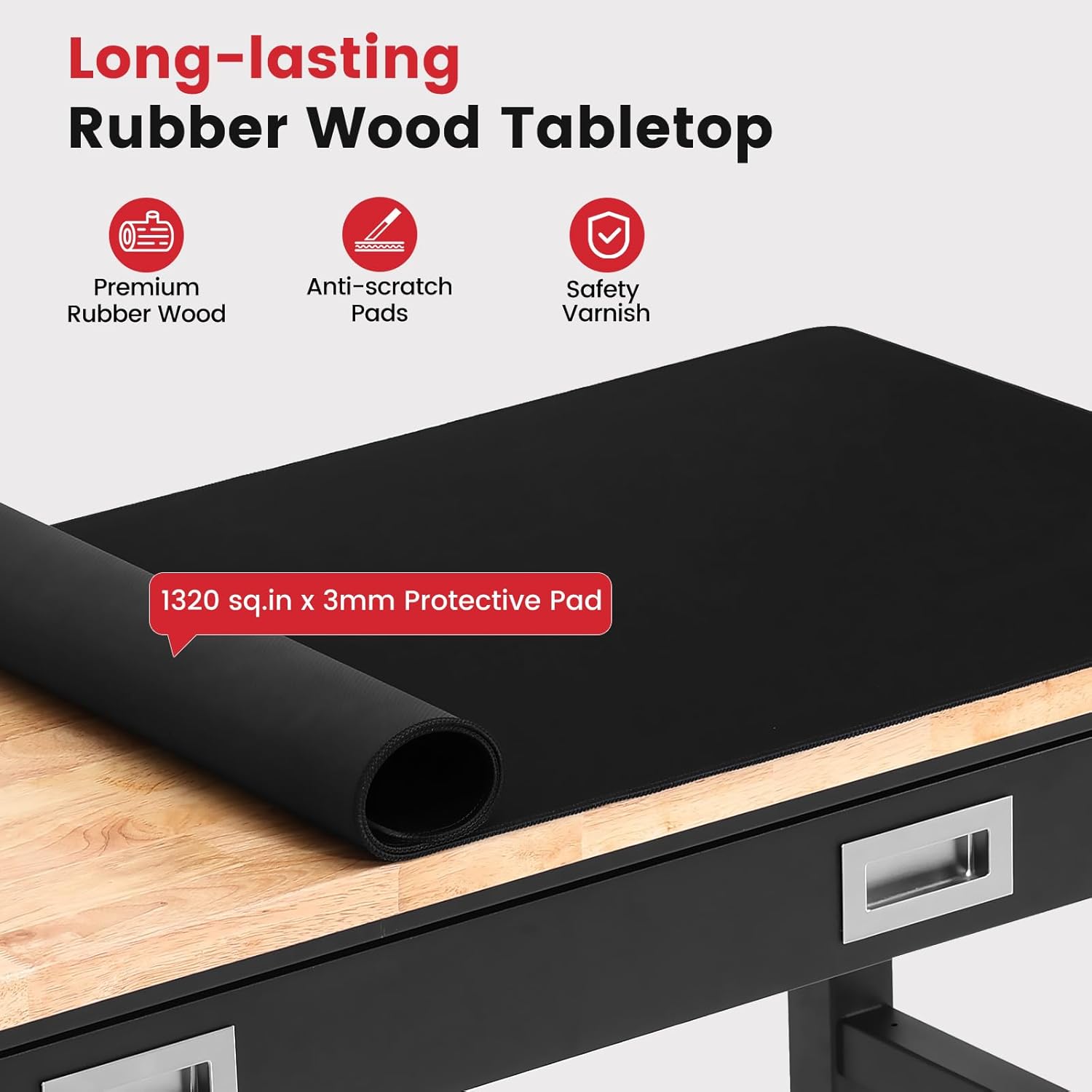 - Heavy Duty Rubberwood Tabletop: 30mm solid rubberwood tabletop supports up to 2000 lbs, perfect for heavy tools and materials. Protective safety varnish ensures long-lasting durability.