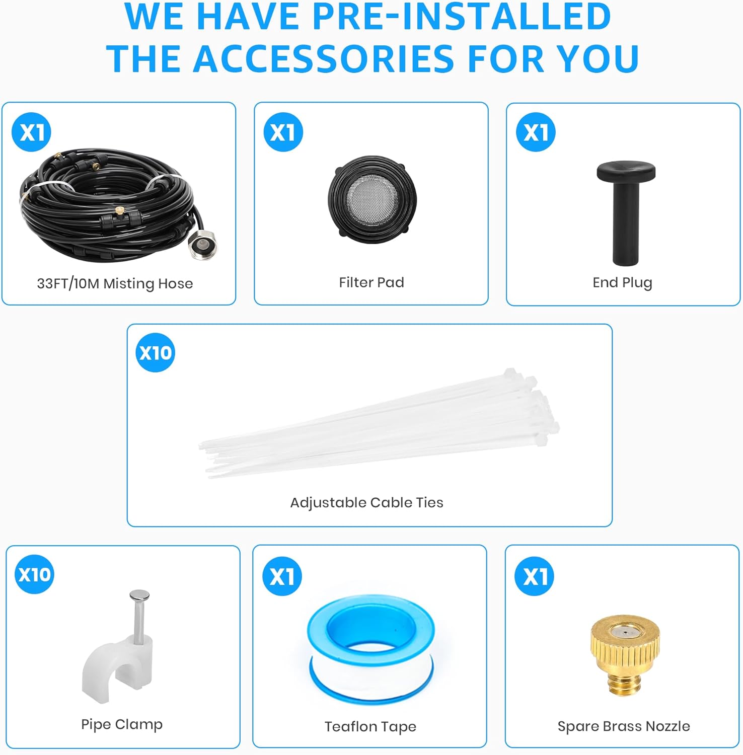 - 【Tool-Free DIY Installation – Customize as Needed】Quick and easy setup—just connect to any standard 3/4" garden hose with the included solid brass adapter. The patio misters for cooling outdoor system is pre-assembled, with extra nozzles and accessories included, allowing full customization for different areas and setups.