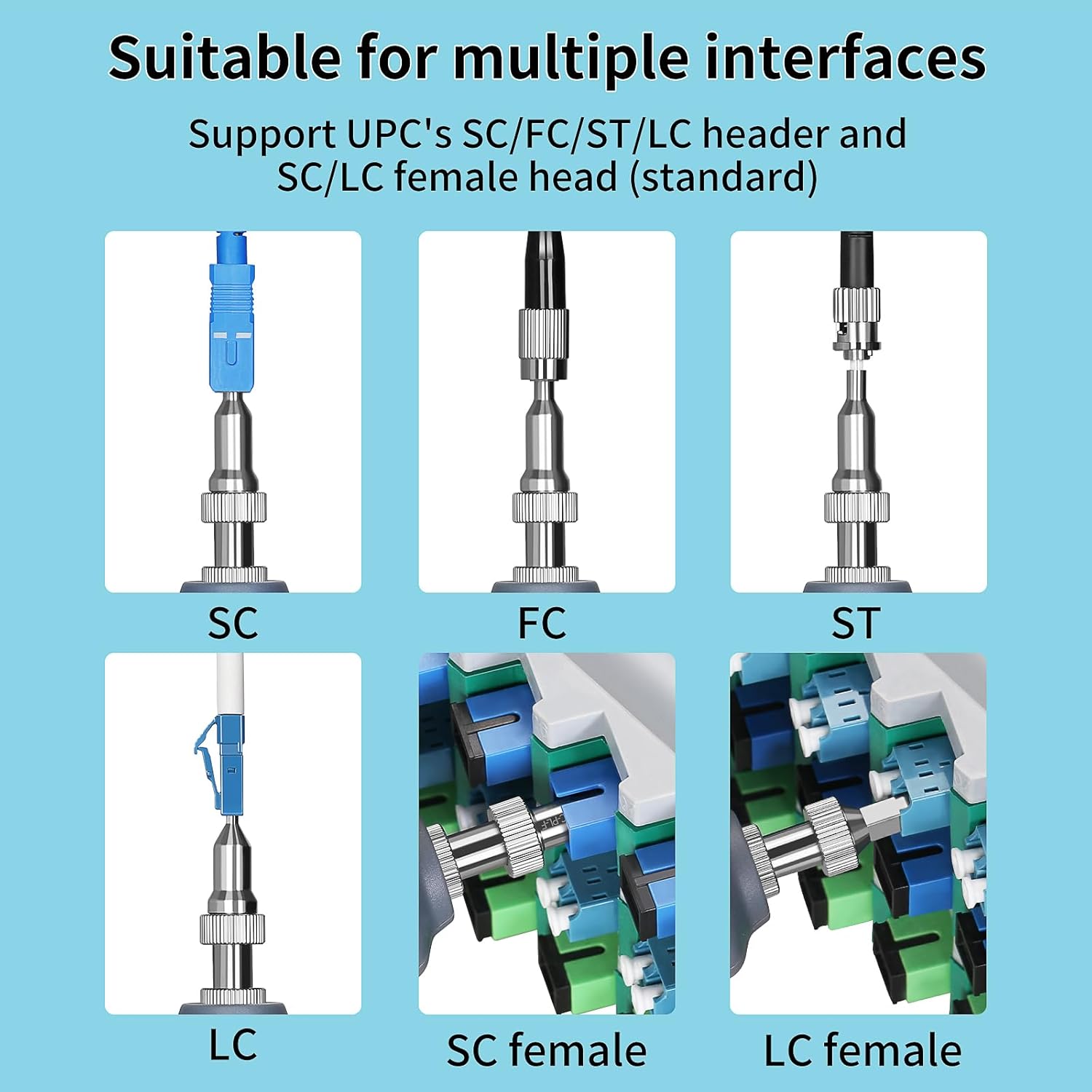 - Equipped with SC/UPC FC/UPC ST/UPC LC/UPC male and female adapters for easy detection of multiple interfaces
