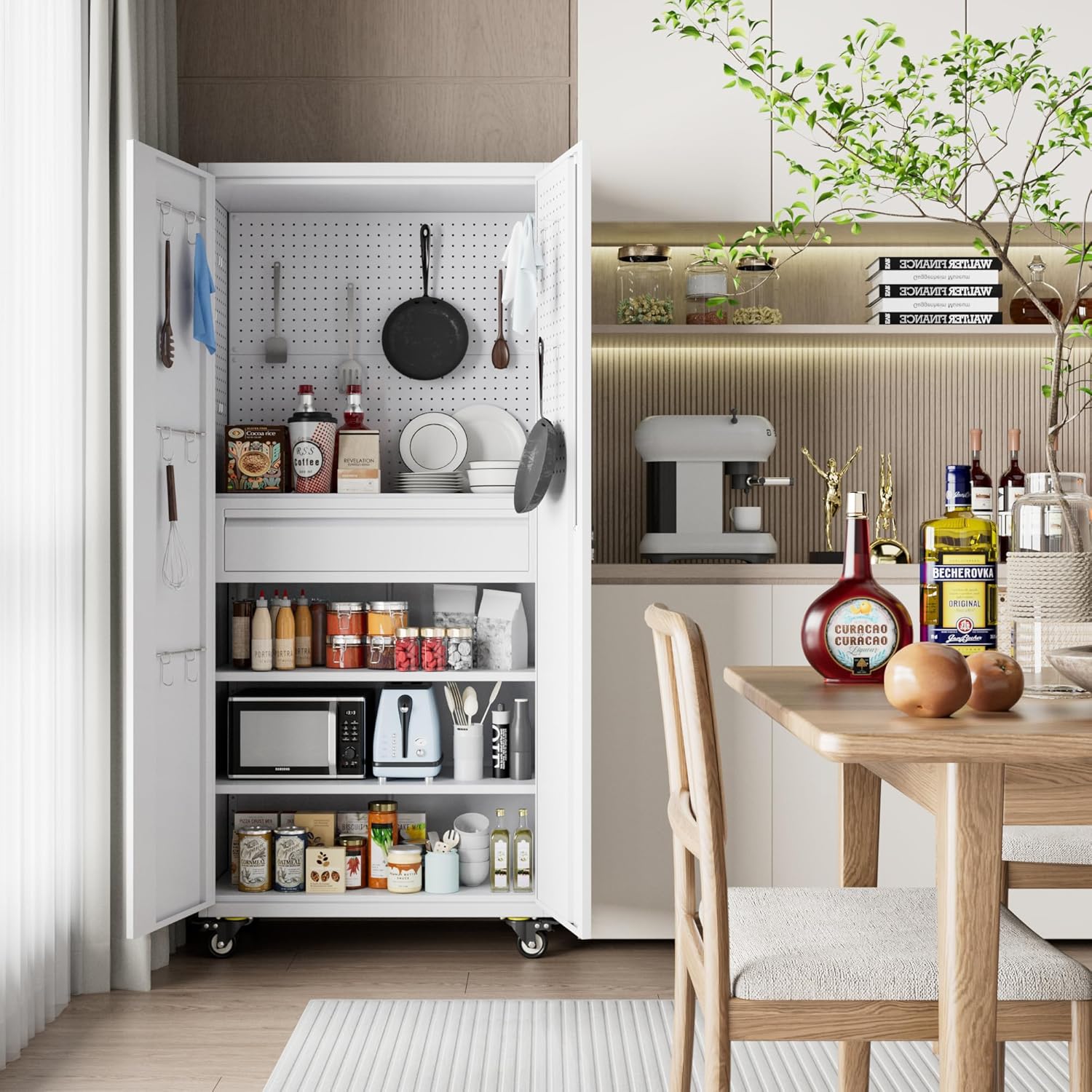 Metal Garage Cabinet with Wheels,71''H Rolling Lockable Steel Tool Cabinet with Pegboard & Drawer for Garage,Home,Office Assembly Required,White