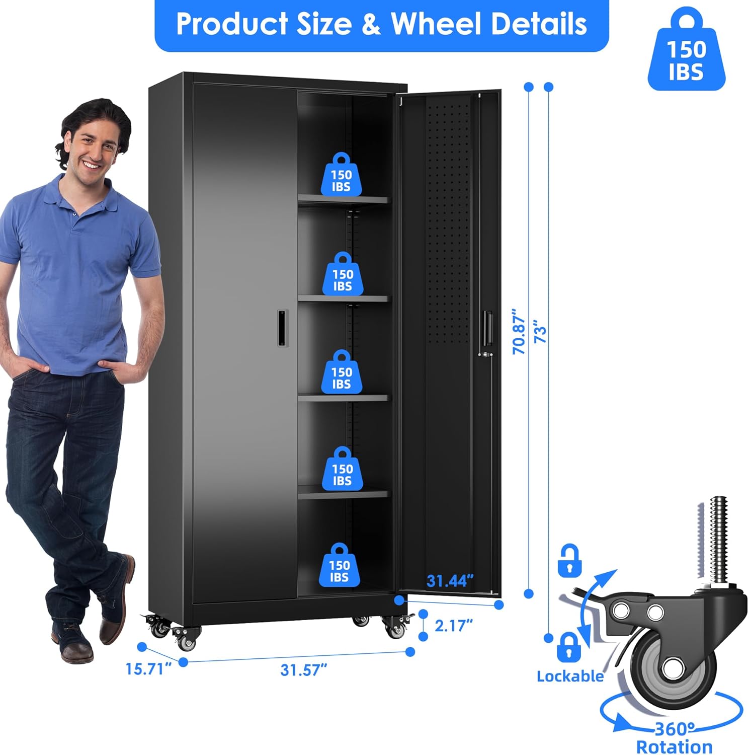 - ăUtility Pegboard & Adjustable Shelves ăRedesign your organizing ways, hang up everything on the door, get effortless accessible for a variety of small hardware, no more searching for things among the clutter. Tall Garage storage cabinet with wheels is designed with 4 adjustable shelves, you can easily meet your different storage needs by adjusting the height between the shelves.Each shelf of the storage cabinet on wheels can hold up to 150lbs