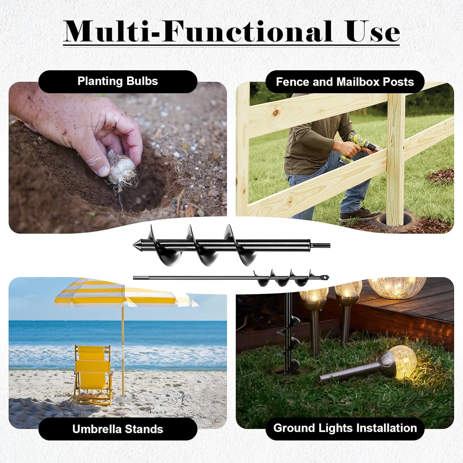 - Wide Application:This multi-purpose garden auger drill bit for planting is ideal for planting bulbs and flowers. Auger drill bits are usually used to drill holes for fence posts, garden lights, patio torches, and sun umbrellas. Our auger drill bit for planting is also suitable for loose soil, soft ground, sand, clay, and silty soil.
