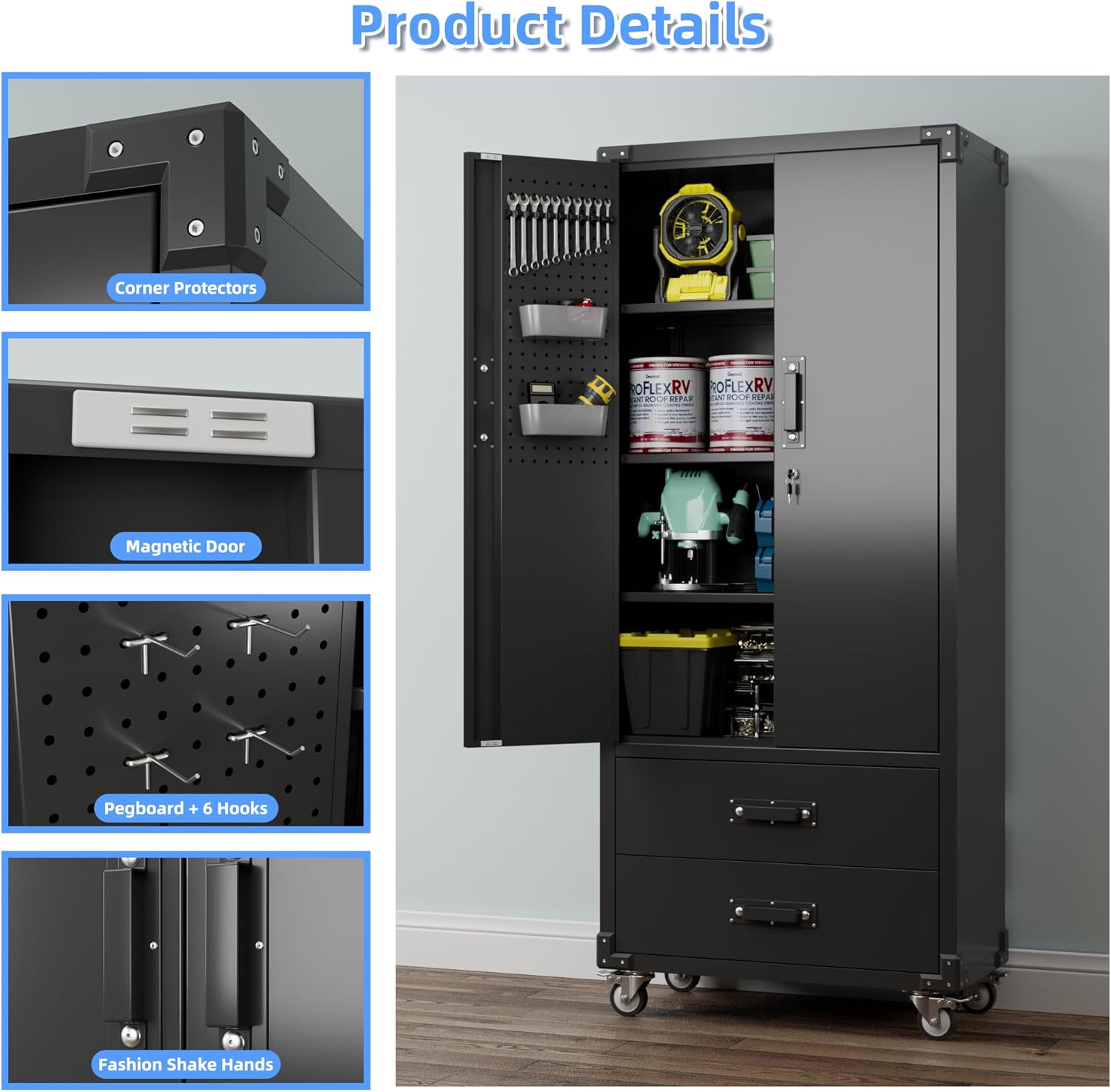- 【Detachable Swivel Casters】Upgraded metal garage storage cabinet has the latest design with movable wheels. It has 4 rubber casters which are detachable. All the 4 casters are lockable which adds an additional safety feature to the design. The wheels are made up of heavy duty rubber which provides full protection and also are easy to move around.