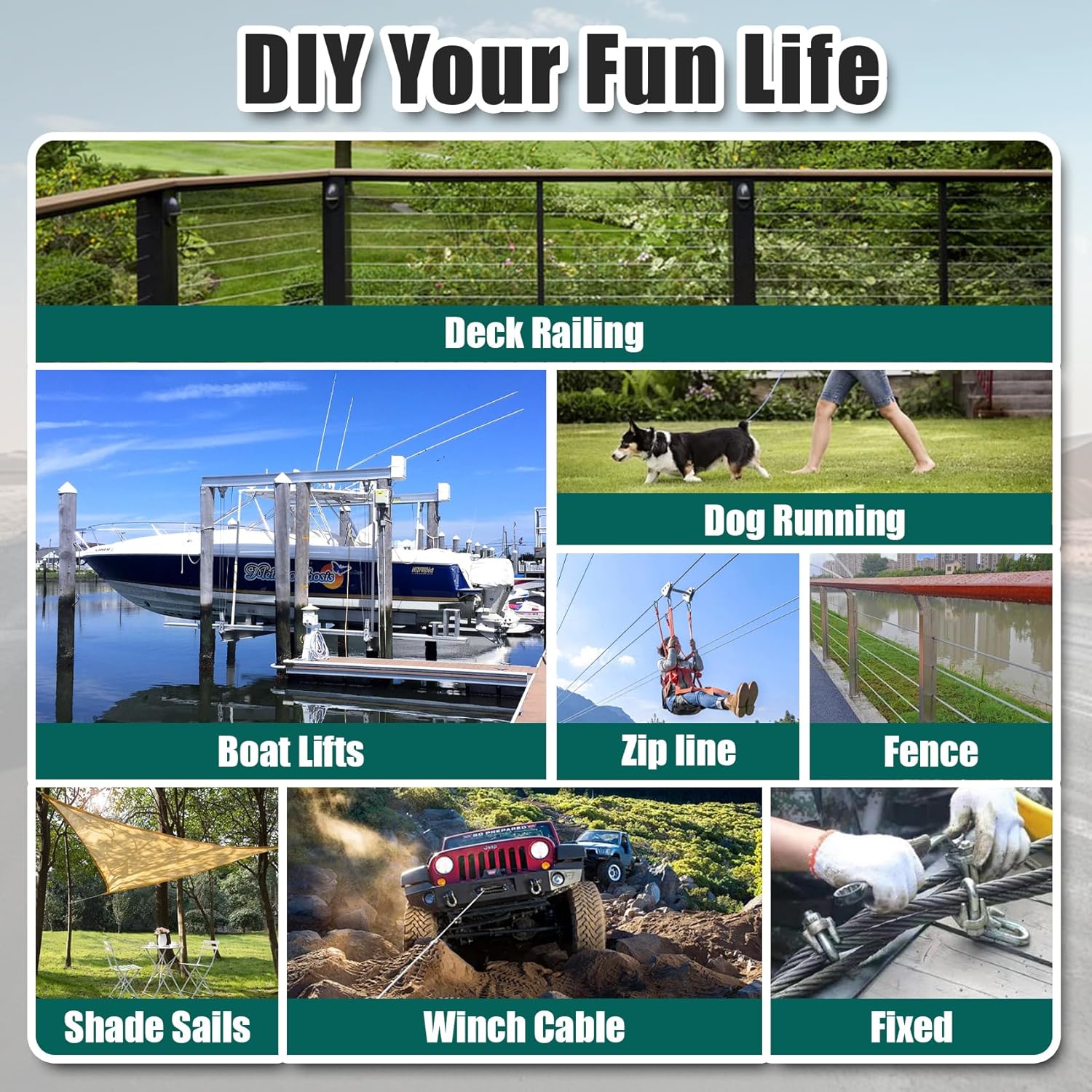 - Widely used: 1"/4 steel cable is an ideal choice for outdoor, ziplines, boat lifts,shade sails,dog runs, garden, deck railings, and industrial buildings.