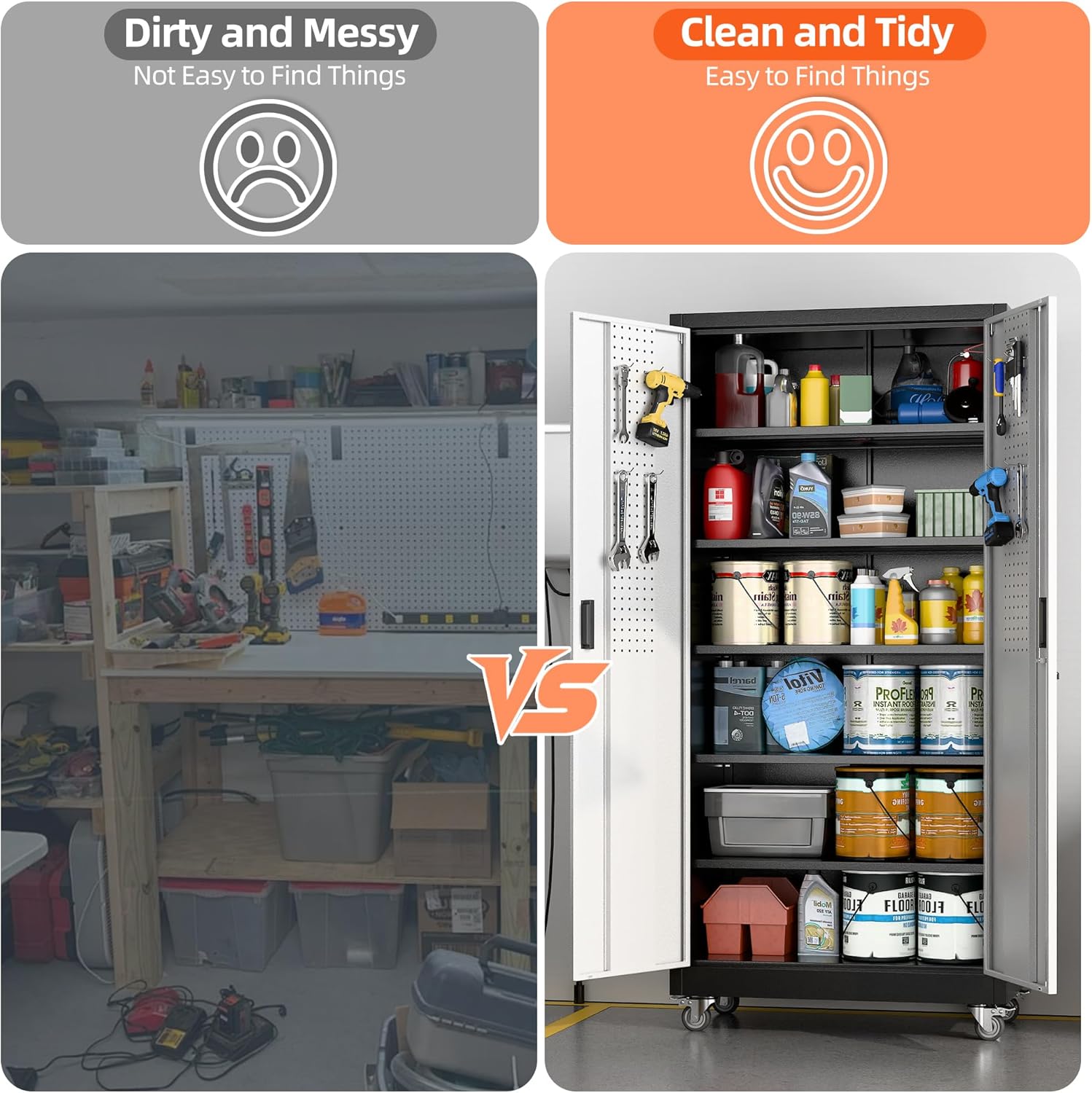 - Lockable & Safe:Steel storage cabinet is designed with 2 plastic handle, right handle with lock and 2 keys to secure your items in the cabinet