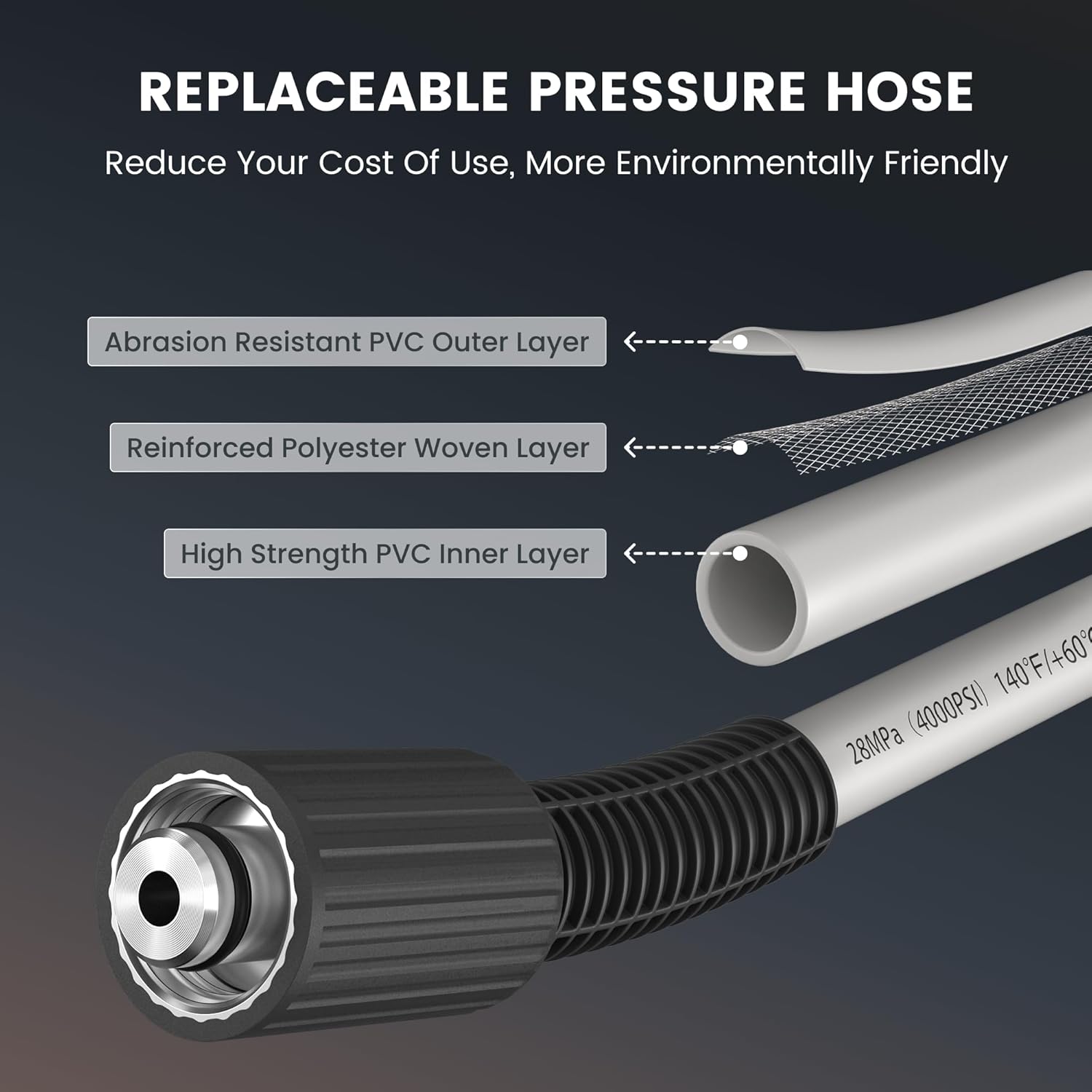 - 100 FT Replaceable Pressure Hose: Giraffe Tools Pressure Washer Plus+ featuring a 100 ft replaceable hose(32 °F-140 °F). Constructed with three-layer composite anti-explosion material, it's designed to tackle even the toughest cleaning jobs. The detachable hose is for easy recycling and reuse, reducing the amount of product waste